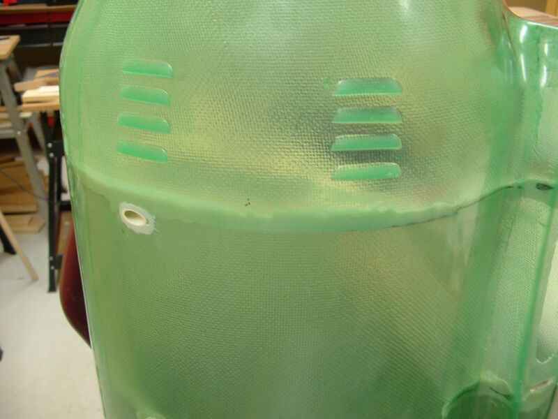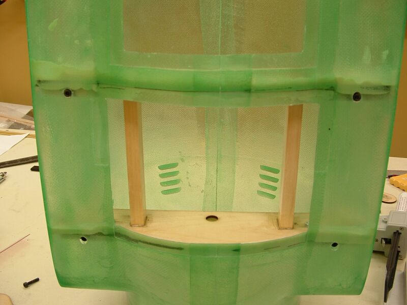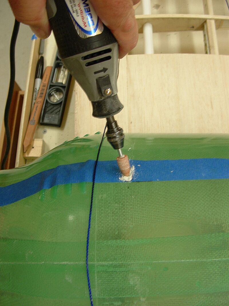 After measuring and measuring I mapped out the holes for the tubes and with the Dremel ground them out. A small round file used for final fitting. I have then snug with no deformity of the fiberglass. Aeropoxy used to glue them in place, then after drying the fuse was masked and the tubes were rough sanded. The ply plate was epoxied in place at this time. Turned out nice [8D]