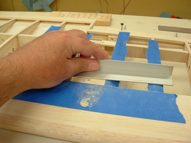 The formers are dry fitted then the wings were placed per instructions with the root TE on the same 1 1/4 in block as the fuse and the W7 rib supported by a 2 1/4 in block (mine was longer to makeup the difference in the in the root block) Incidence was checked and set at 1 degree. The wings were taped to the fuse. The aluminum extrusions were dry fitted and the formers adjusted and checked for level. The extrusions were sanded on the back cleaned with alcohol then epoxied in place and allowed to dry after checking all level points and wing incidence for a final time.