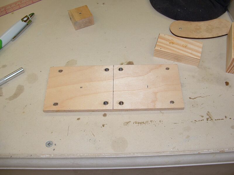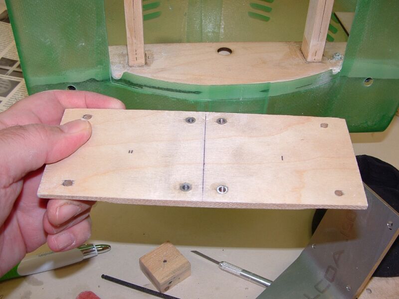 The mounting rails are next up. They were dry fitted before the formers were installed so little sanding needed here, Epoxied in place. The holes for the 4-40 1/2 in bolts were drilled and set into the aluminum extrusions. I had used a Sharpie marker on the plates to better see where to drill. The ply mounting plate was measured and drilled with a 3/16 bit. The holes for the blind nuts were enlarged with the Unibit to 7/32. Unfortunately the blind nuts protruded past the surface and needed to be filed down so the aluminum gear rest flush with the ply plate. The fuse needed trimming to make the gear fit flush with the plate and former. The plate was centered and 3/16 holes drilled in the rails. The Unibit was used to enlarge the holes for the blind nuts and they were placed with epoxy.