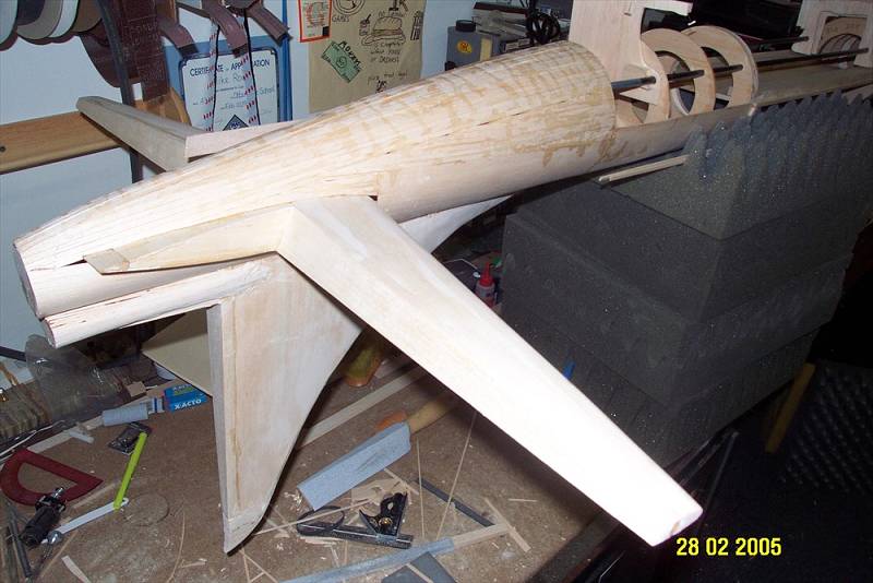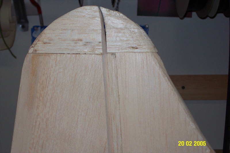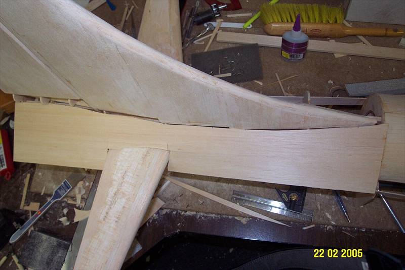 The second photo shows the start of sheetig the tail section of the fuse. The tail of this fuse is tapered so it is not possible to sheet with a wide strip of balsa.