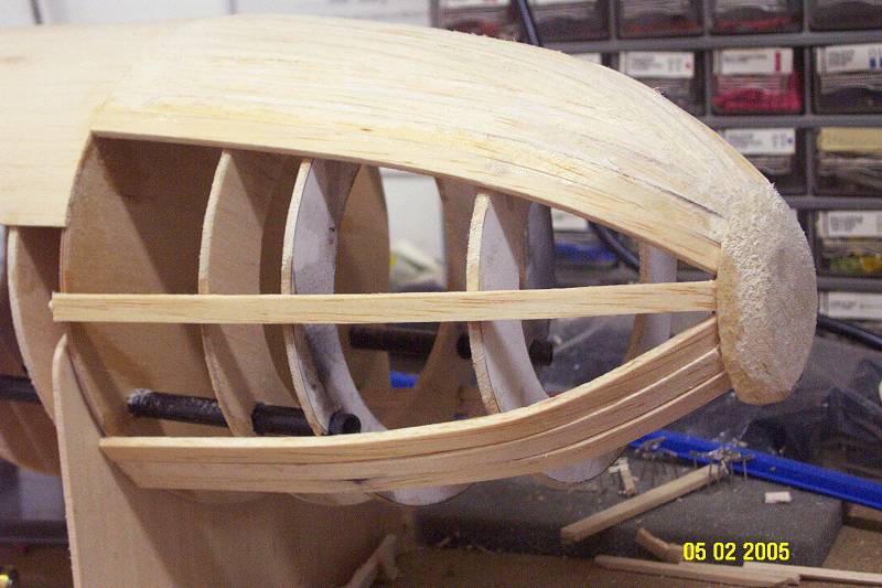 Here is the nose a bit further along. I used a Master Airscrew balsa stripper to make the strips and then soak them in a container of water for a few hours. They wouldn't break when bent and CA worked just fine.