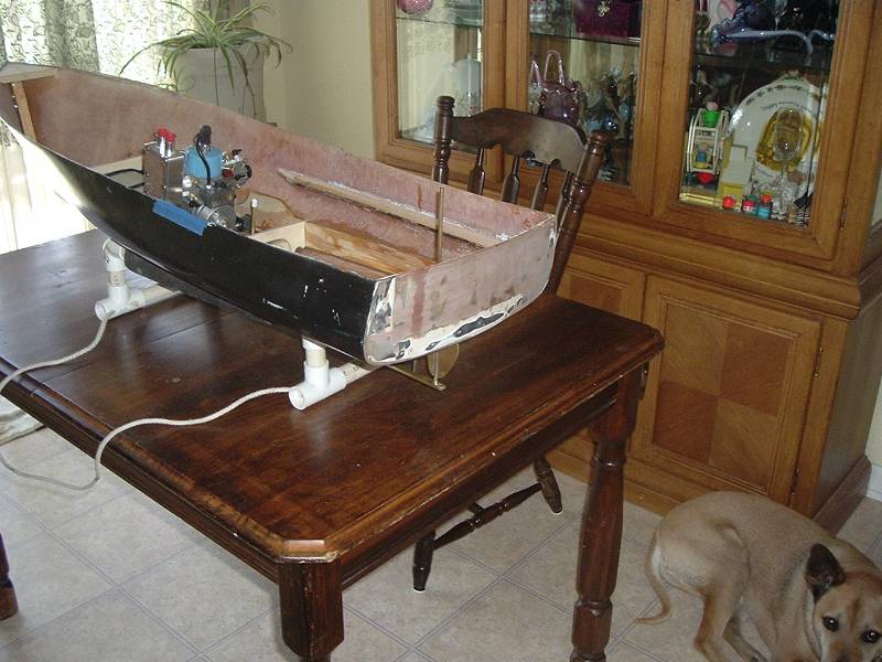 well guys it's slowly coming along i picked up a 28cc fugi motor out of a rio 51 the guy never had in the water. i bought a x-can muffler for it and will have to extend the stacks out hte cabin. the motor rails are bieng glassed in now as i type. but here are some new pics