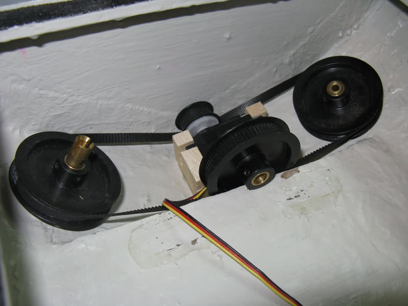 Rotating setup. Toothed timing belt on a continuous rotation servo with a 1/2 drive reduction.