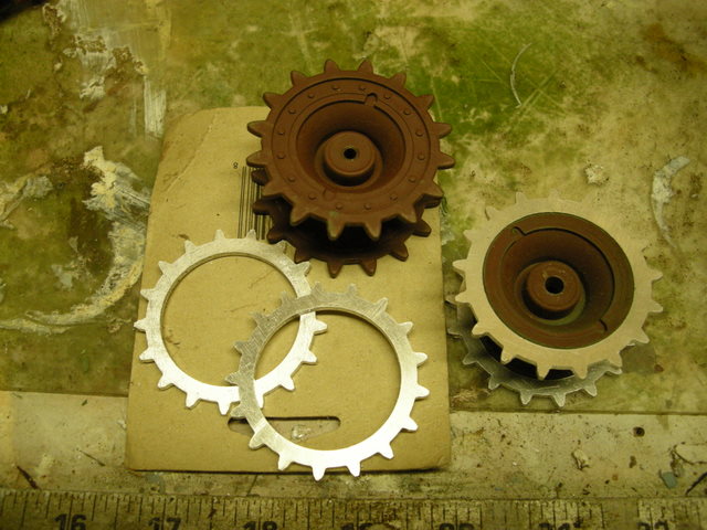 Another small step forward. i received the adapter rings i ordered from Daryl Turner. These rings reduce the overall diameter of the KV-1 sprocket to the IS-2 sized sprocket. It seemed like a small detail but i wanted to strive for a close resemblance. I have turned the KV-1 sprockets to accept the adapter rings (see photos) one photo shows the new ring in front of a stock KV-1 sprocket so yo can see the small difference in overall diameter. I have made a new hub cap assembly which i will add later. The rings will be J-B welded to the turned hub and should have more the sufficient strength t keep up with rough treatment. In a previous post i showed my version of a reconfigured HL recoil similar to what either yellowshaker or bubbajoex made some time ago. I have mounted the turret drive so this puts me closer to finishing the turret. i hope to actually get this tank finished this month but life keeps throwing small obstacles at me.