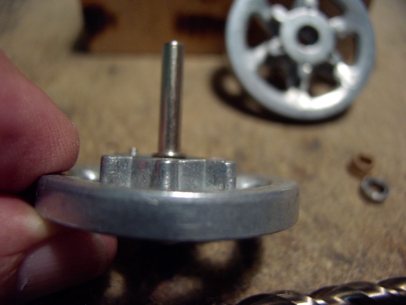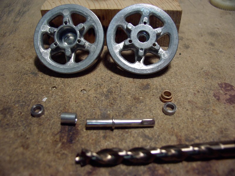 This build will be a total ground up gig. First up is the idlers. You know my fetish about bearings, so the first thing I did was install some 4 x 7 flangeless bearings, two each, in the idlers. You have to ease the 7 mm hole in each half of the idler down about 1.5 mm so the geometry of the axle shaft works, because the stock bronze bushings are pretty flush with the surface of the hole. The bearings have about 1.5 mm greater thickness on the 7 mm part, ergo the hole easing. This is accomplished with a flat spiral drill, available from DeWitt in numerous sizes.