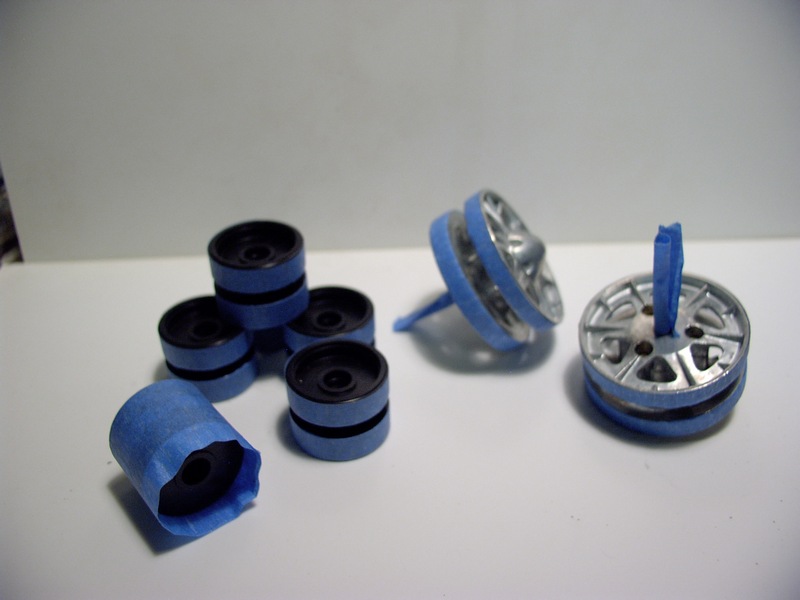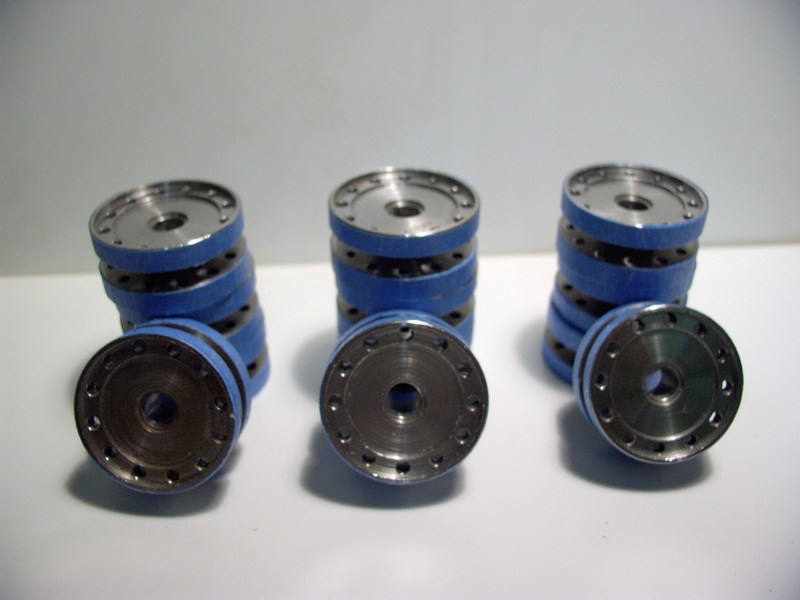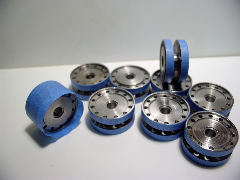 I simply put a blue painter's tape all the way around the wheel, roll it on the work bench to seat all the tape, then take an Xacto knife and cut off the excess tape so only the contact surfaces are covered. Tomorrow it the weather holds up I'll blow some primer on all of them. On the idlers, I also tossed the three phillips screws in each assembly in the spares bin and replaced them with socket head screws of the same length.