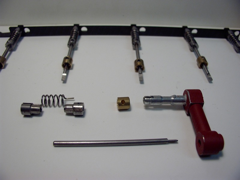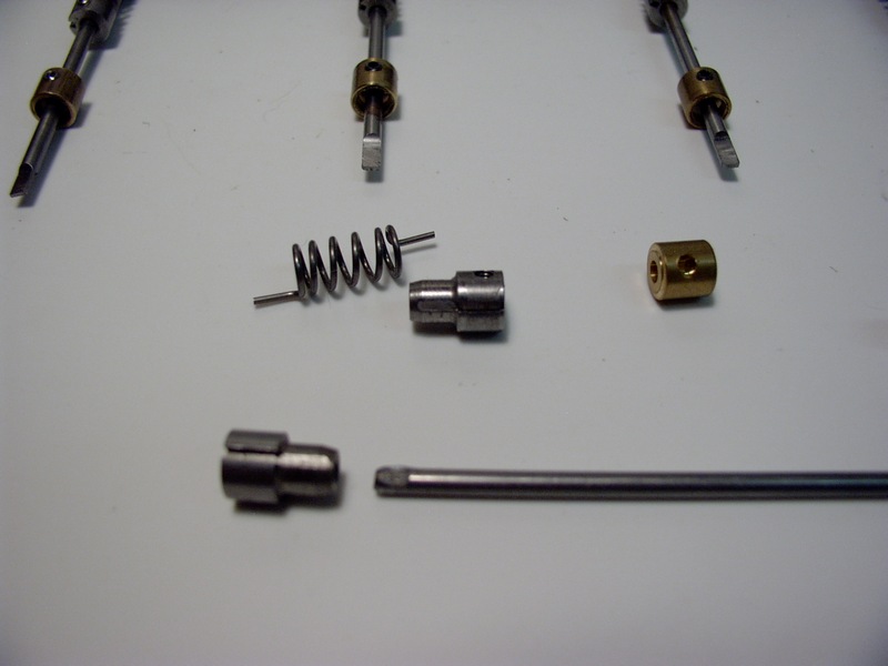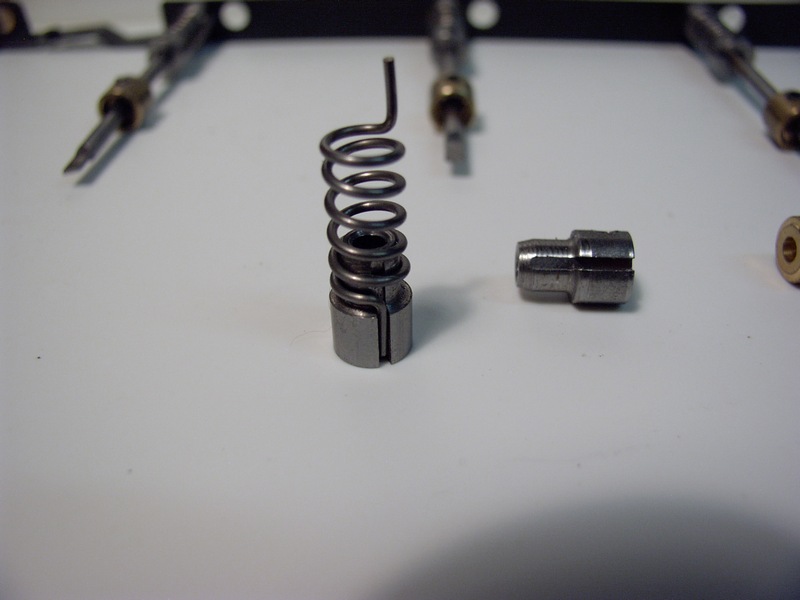 After you drill out the hole, take one Corleis suspension anchor and one bar. Test fit the bar in to the anchor. If there is the slightest bind of the bar in the anchor, simply use 400 grit cloth and dress up the end of the bar that goes in the anchor. Once he fits and works smoothly, set the bar aside for a minute. Now you have to install the coil spring on to the anchor, then set the bar locking piece in the other end of the spring. The ends of the spring fit in to a groove machined in to each piece. Make sure the spring is seated as far down as possible. Put a small dab of Tamiya teflon grease or simple oil on the end of the bar, and insert it through the locking piece and down in to the anchor. Next, install the brass collar on the bar, lightly tighten the allen screw in the collar, and now you bolt the anchor the the suspension floor brace. Since you are going to be adjusting this system, make sure the allen screw in the locking piece is positioned straight up.