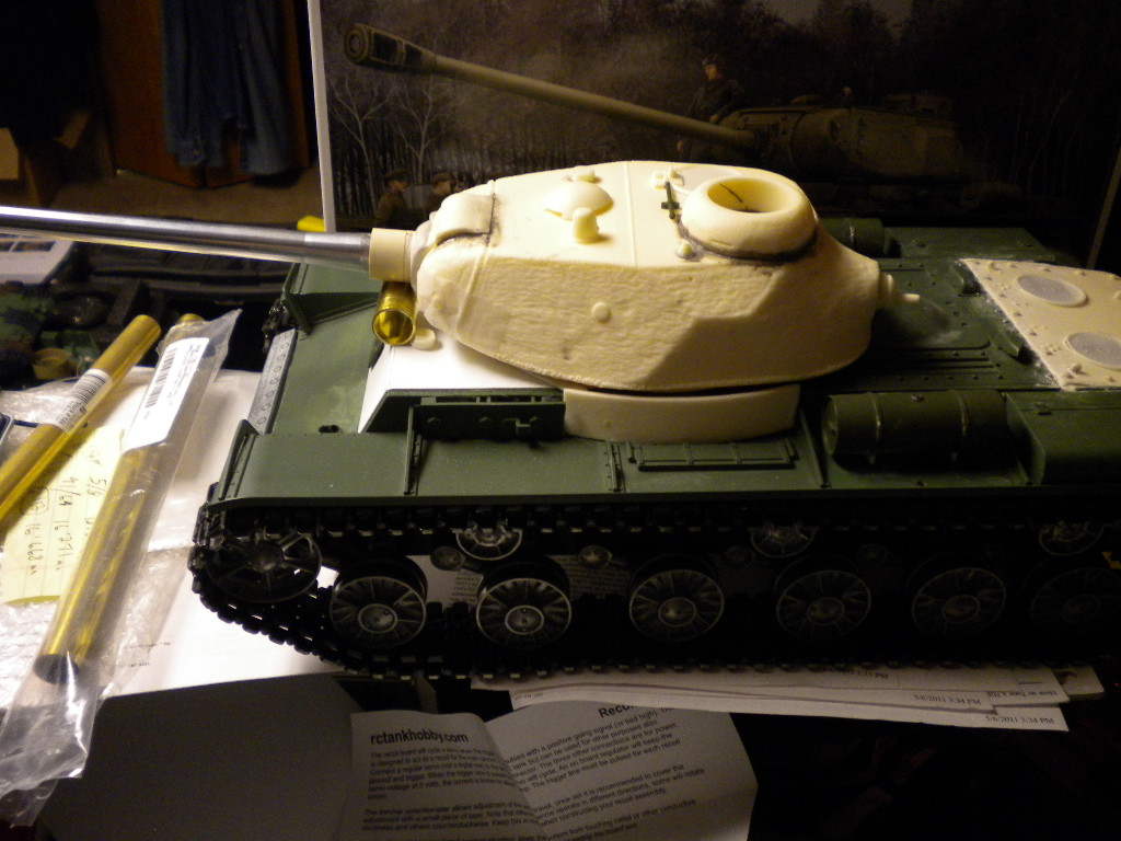 It has a Asiatam lower metal hull Jurckenburg KV-85 turret converted for 122mm barrel had this turret laying around so used it even tho its not correct on the front of the turret it was cut to short the barrel mantel should of been wider more like the Profinine kit . You can now buy the turret spruce from Tamiya USA .The barrel is set up with servo recoil cause I'm using the Clark TK22 in it along with HL elevation and HL hi output flash and a TBU the upper hull is a HL KV-1 .