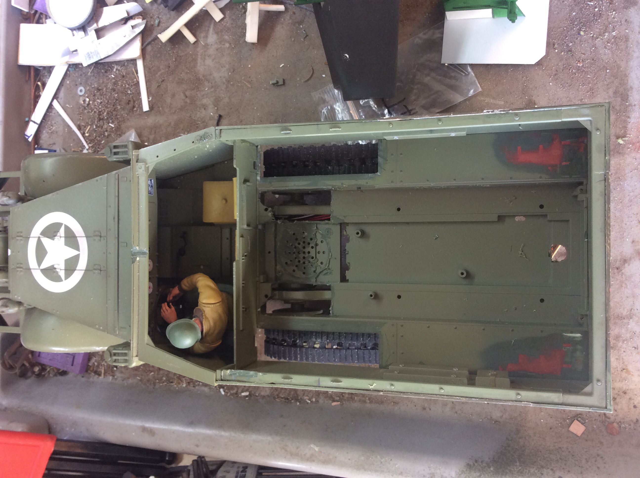 Ive been back at work on my tank destroyer. Got the gun shield fabbed up and the gas tanks removed, as well as the interior frame ledge that goes around the inside of the box, I cut it out and reglued it to the top edge as in pictures I have of the TD half tracks.
