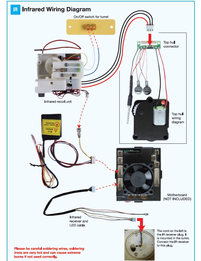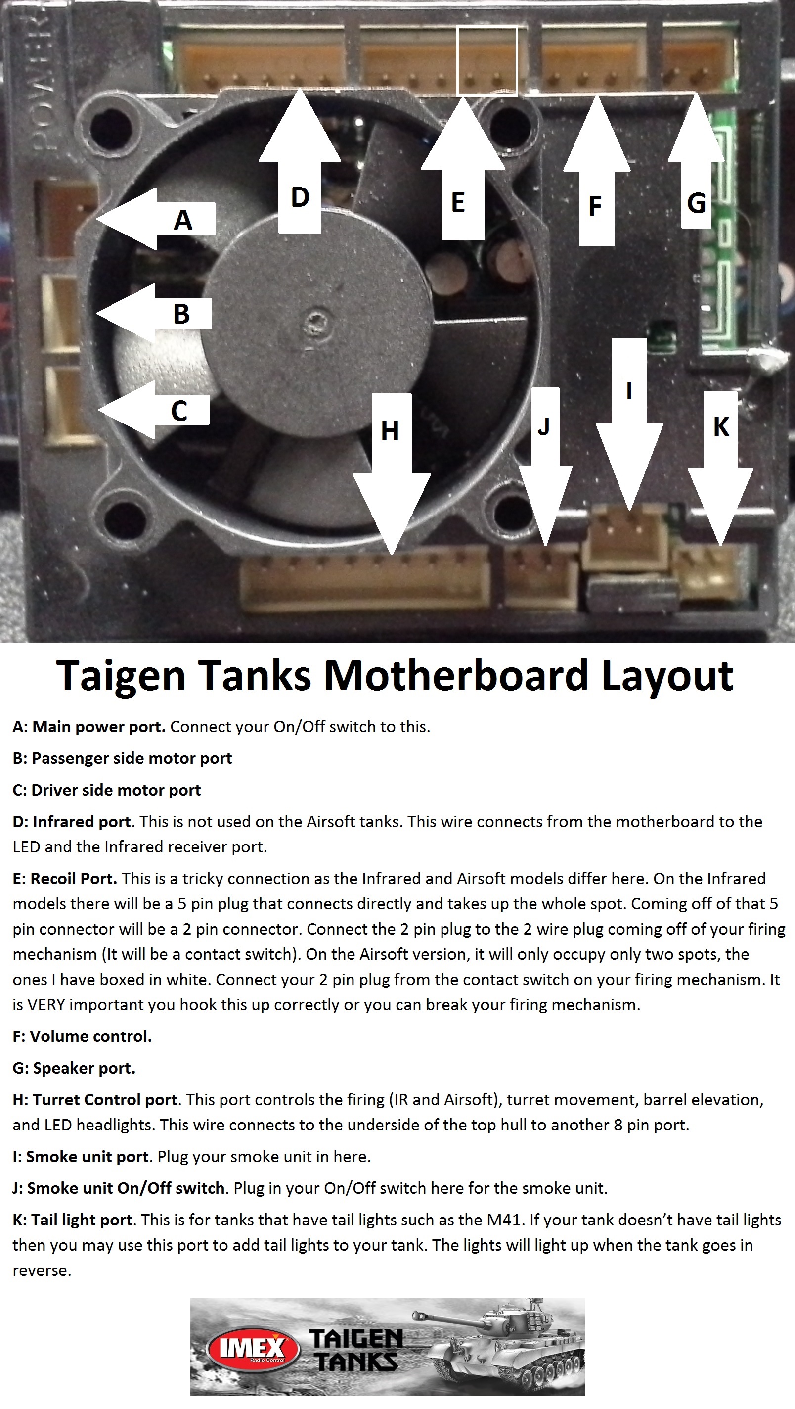 i had a problem with my new Taigen Sherman and a couple of the wires got caught in the turret rotation motor and where yanked out. They come from the 3 wire plugin on the main board,at the top beside the other 5 wire plug. This is the ir version. If someone could take a picture of the main board with the plug in and wires attached that would be great. The red wire stayed in but the green and yellow were pulled out. Of course I then took pins out to retire and promptly forgot which socket they fit into.