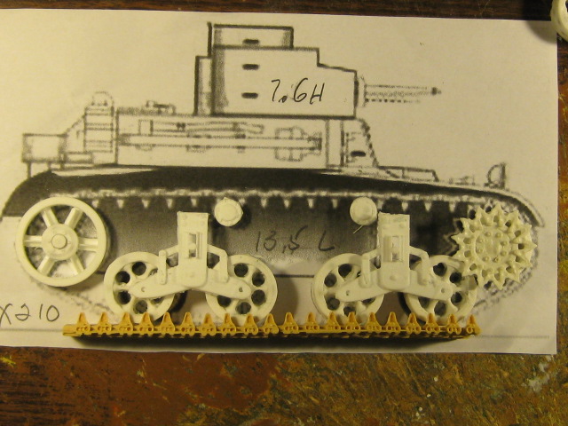So these are the same tracks as what's on a Stuart? What about the rest of the running gear? Do you think the roadwheels from the stuart are the same? I guess I'll have to start searching for 1/16th stuart tracks. But it sure is small. I might be able to do static, but cramming electronics in this will be a real chore. Maybe I should explore the electronics they use for 1/35. But I really don't like messin' with electronics! I'd much rather be putting a new road in my little village, or building a new barn for it (this weekend!), or painting a tank, or ...