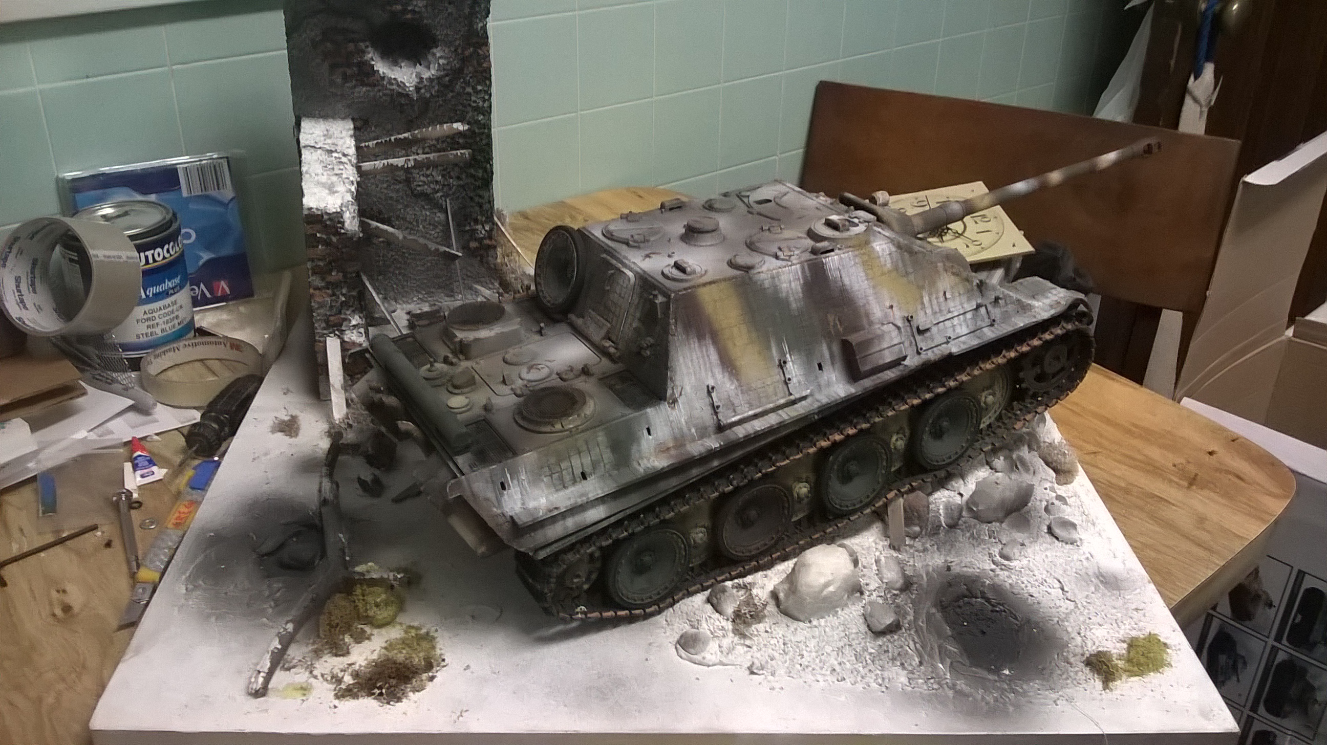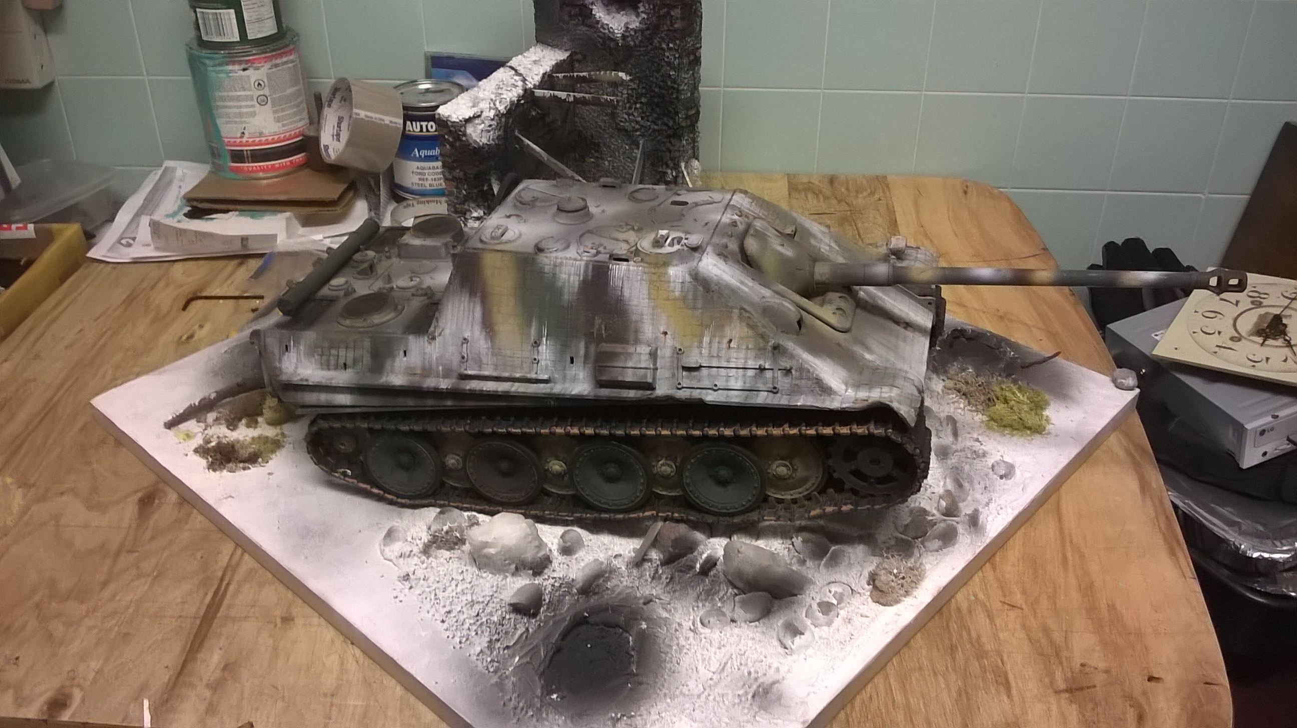 i made my snow with drywall mud mixed with acrylic white paint and small fake gravel i still plan on doing a better building on here and more detail plus a stained framed base, i like to use them for taking pics with my tanks the other is a summer theme dio