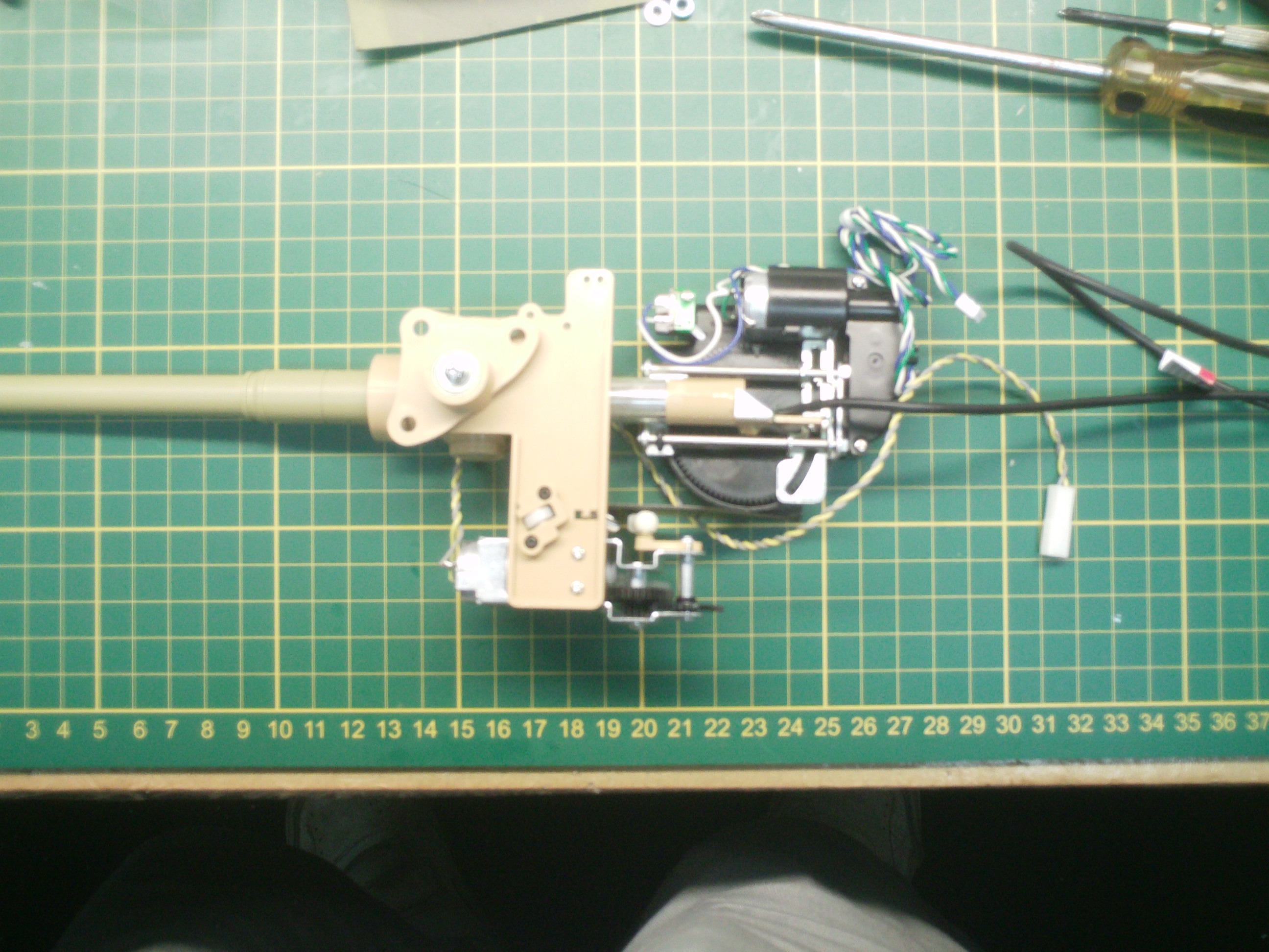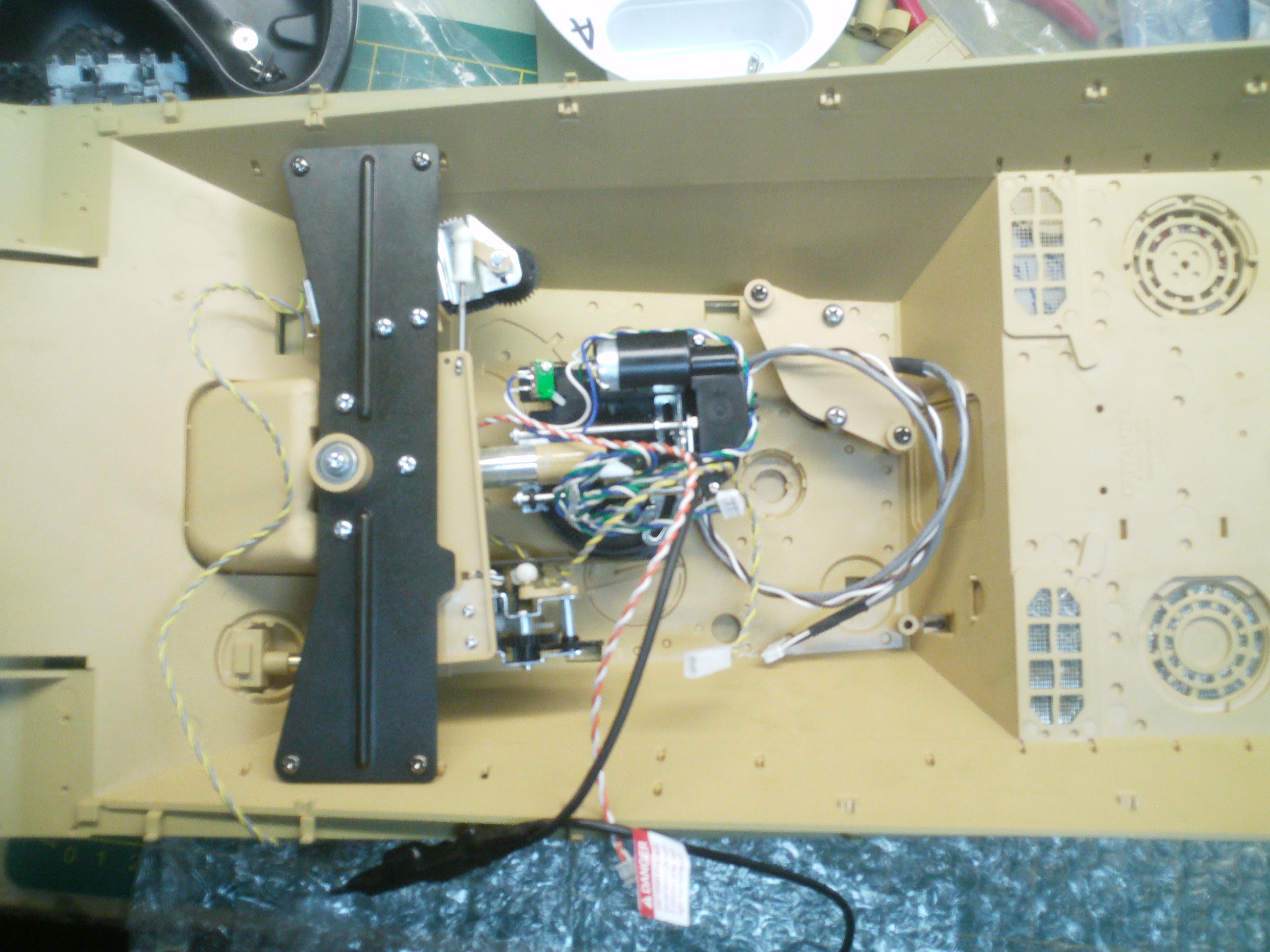 Apparently the little nut on the top and the big yellow nut has fallen out. TO make matters worse I noticed a green wire has been cut off by the recoil device. It seems that Tamiya knows about this issue, as seen in other threads, and refuses to fix it and builds the same crappy mechanism. Very shameful that anyone has to even make mods to the recoil mechanism in the first place. Hopefully Tamiya is reading these threads and understands that the amount that you pay for their products does not excuse such bad attitudes toward customers.