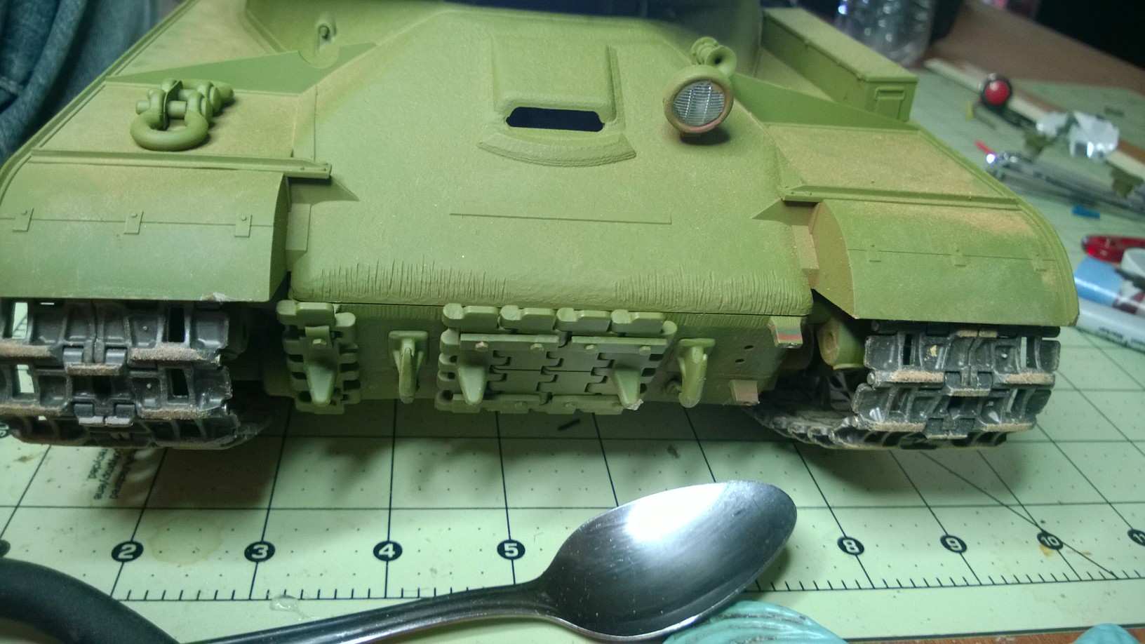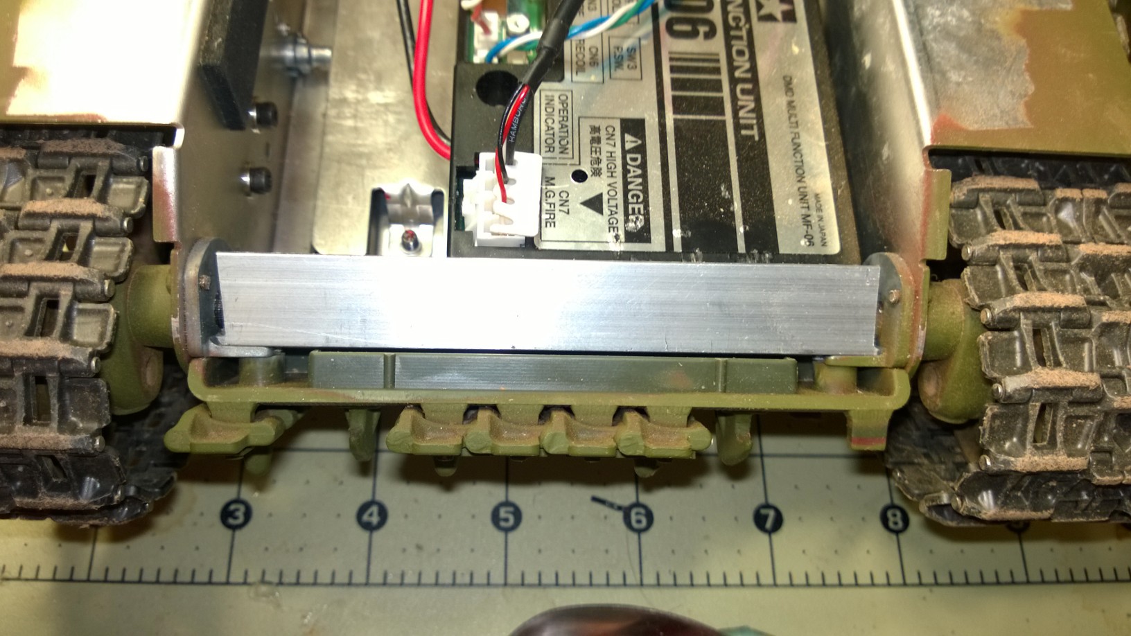 The front end would be much stiffer if you could add tabs that tie the sides of the hull to the plate that you have fabricated. The way the cast L-shaped metal pieces are friction fit between the plate and the front glacis, its possible for the tracks' torque to gradually work the L brackets of position.