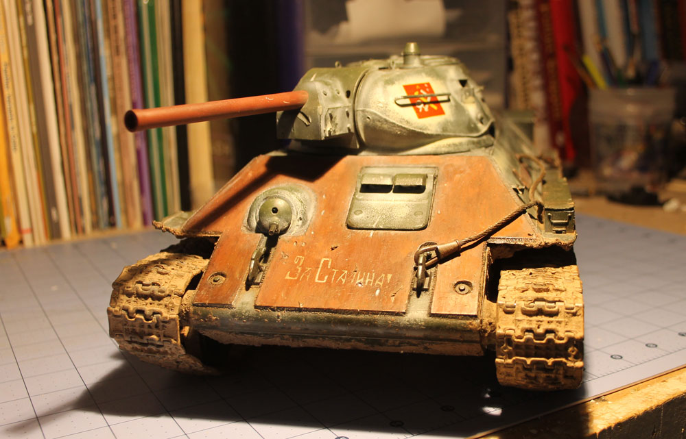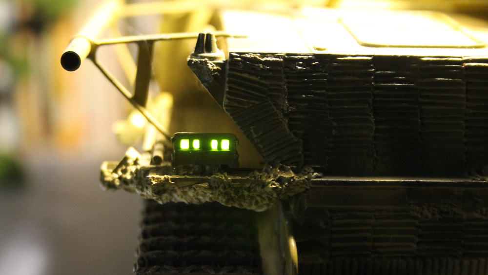 I couldn't let the brake light function on the MFU, so I added LEDs to the nav markers. I'm not sure if the rear ones were red, but what the heck...Also added the turret seams, footholds, tarps clips, etc. I made the decals of the Pravda School from Girls Und Panzer to fight along side my son with the T-34.