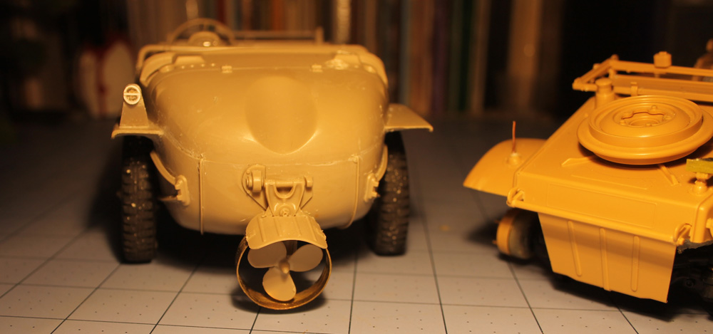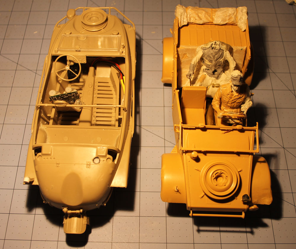 Eduard Schwimmwagen and Tamiya Kubelwagen, both 4WD and working Notek and convoy lights, the Schwim, swims using a small helicopter motor built into the prop housing. Moves pretty fast, I just need to time test since the prop runs on a 1c, I don't won't to get LVC 100 yards off shore...Both will have animated crew, the Schwim's steering wheel pivots with the wheels, so the driver's arms will be articulated like the Kettenkrad.