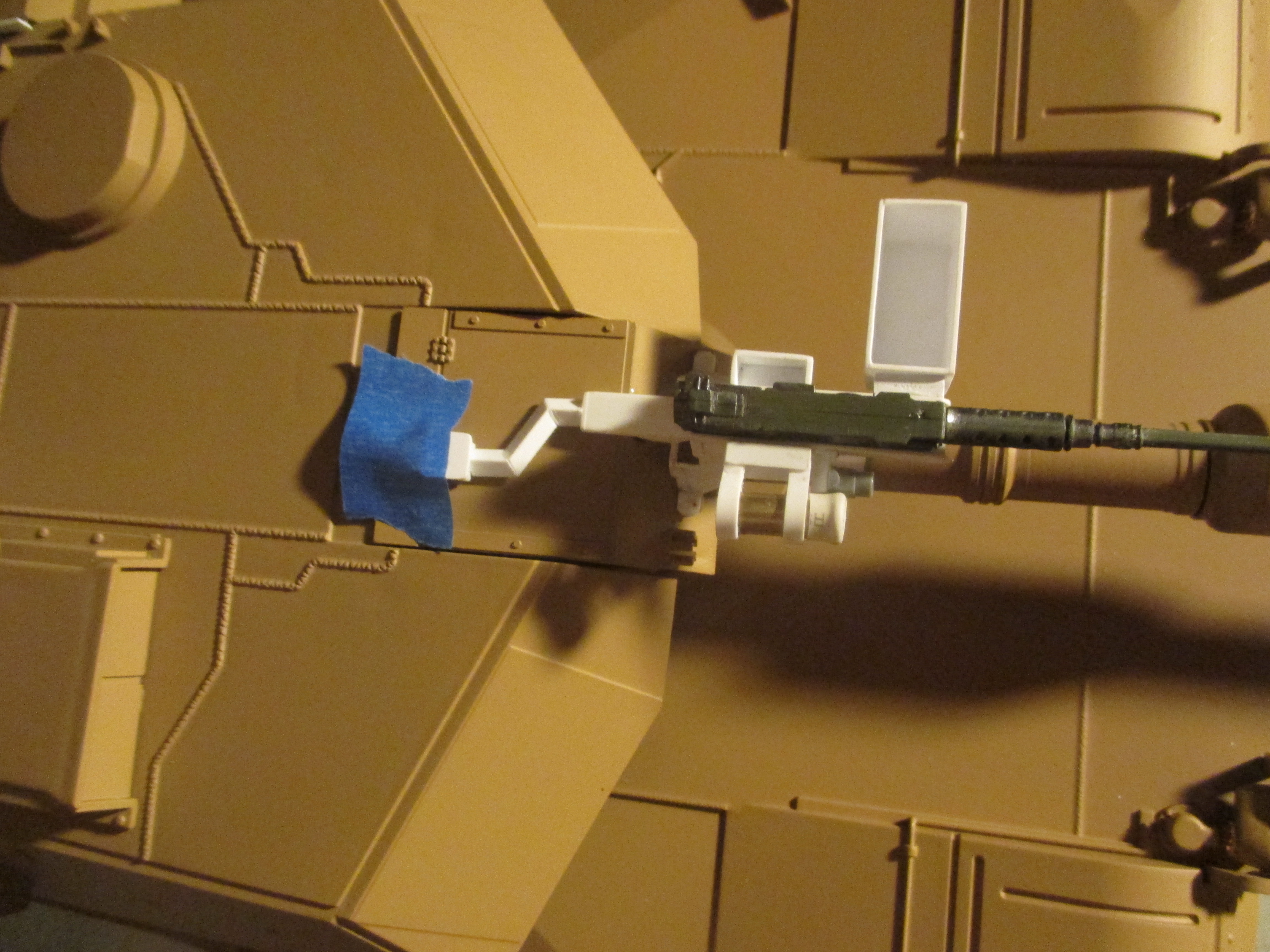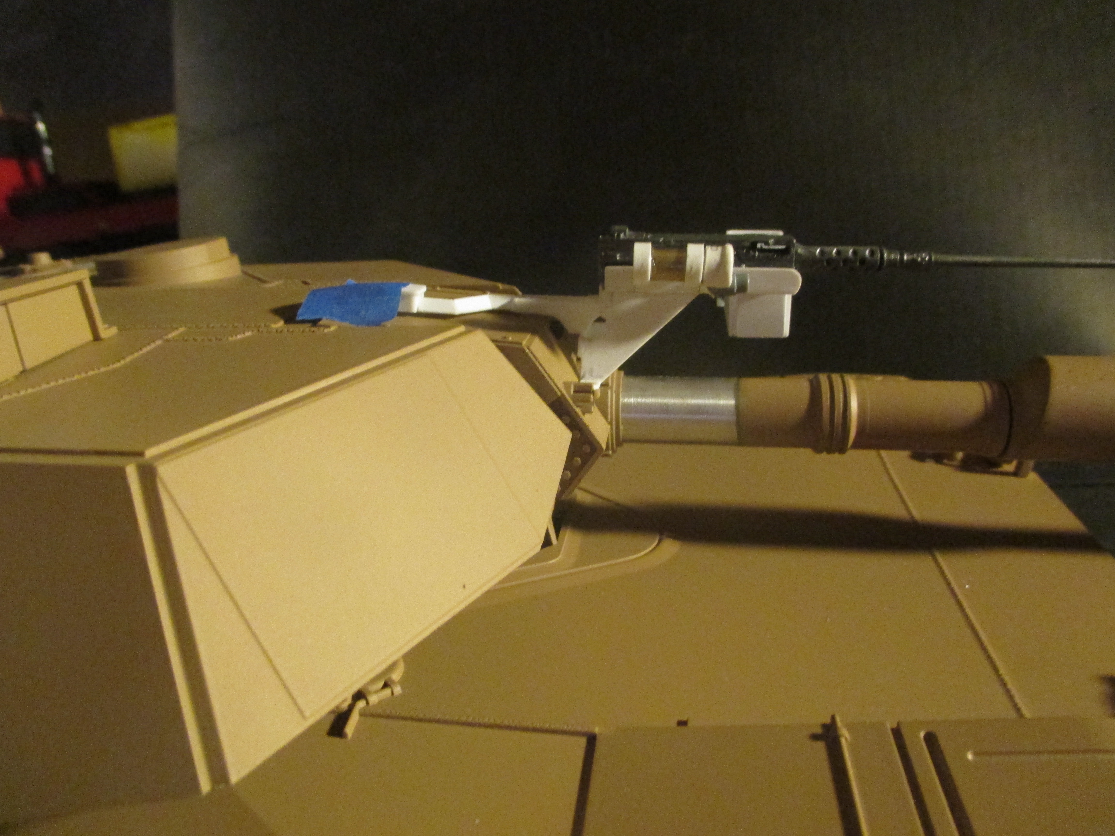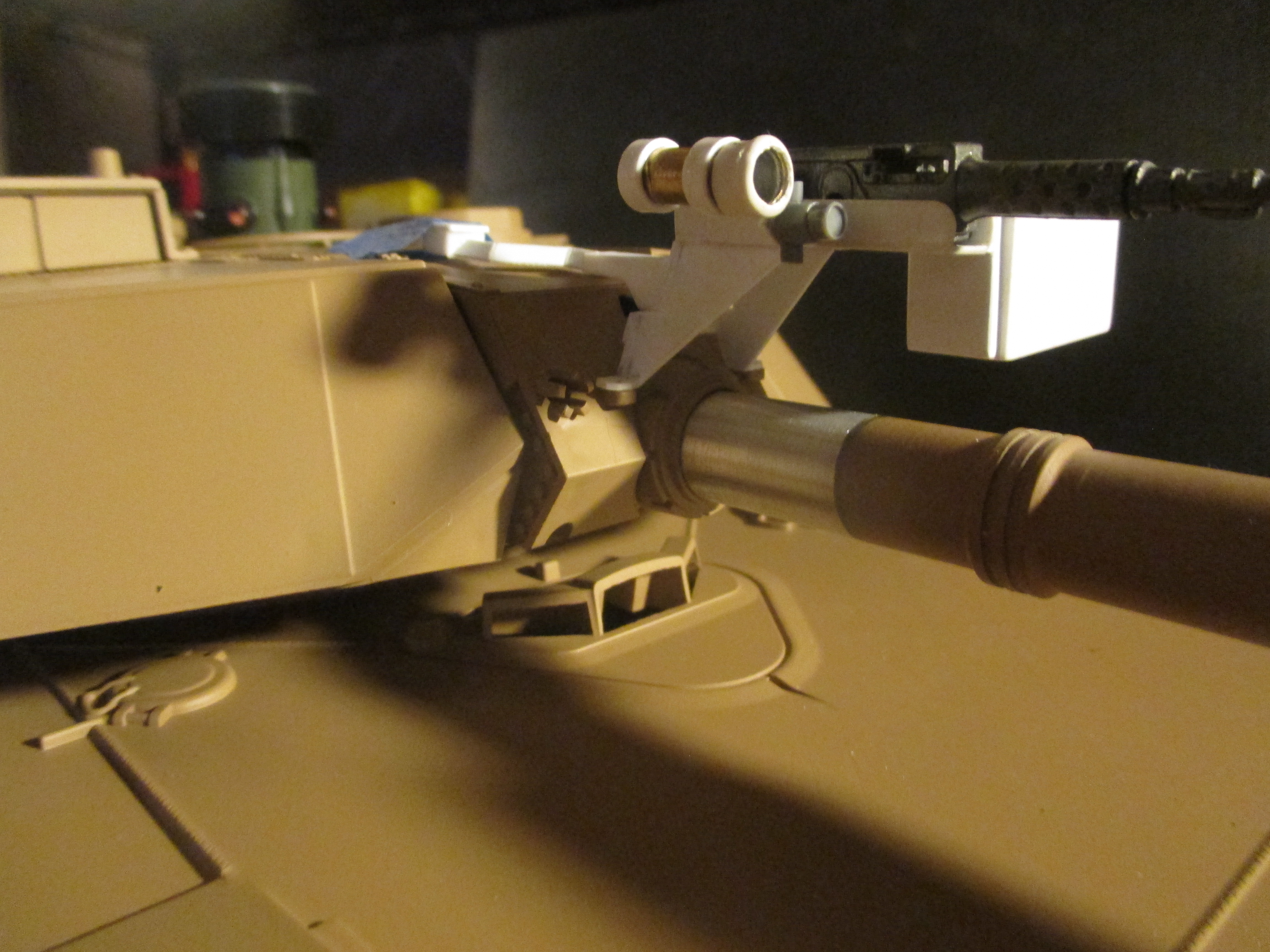 This weekend I put this together. It's a 50. cal mount for the extra .50 that some Abrams have mounted on the mantle. I just got an Abrams fixed up by Dan at Battle Armor and the IR emitter is mounted in the mantel just above the gun tube. I wanted something a bit more cool looking than that so I scratch built this machine gun mount to cover the LED plug and show a bit more pzazz. I cut all the parts to eye just looking at photographs of real ones. I put the IR LED in the place where the spotlight is on the real tanks. Just like the real ones, the .50 cal can ride in the mount, or not, but the IR LED is always ready to shoot. It was a fun build.