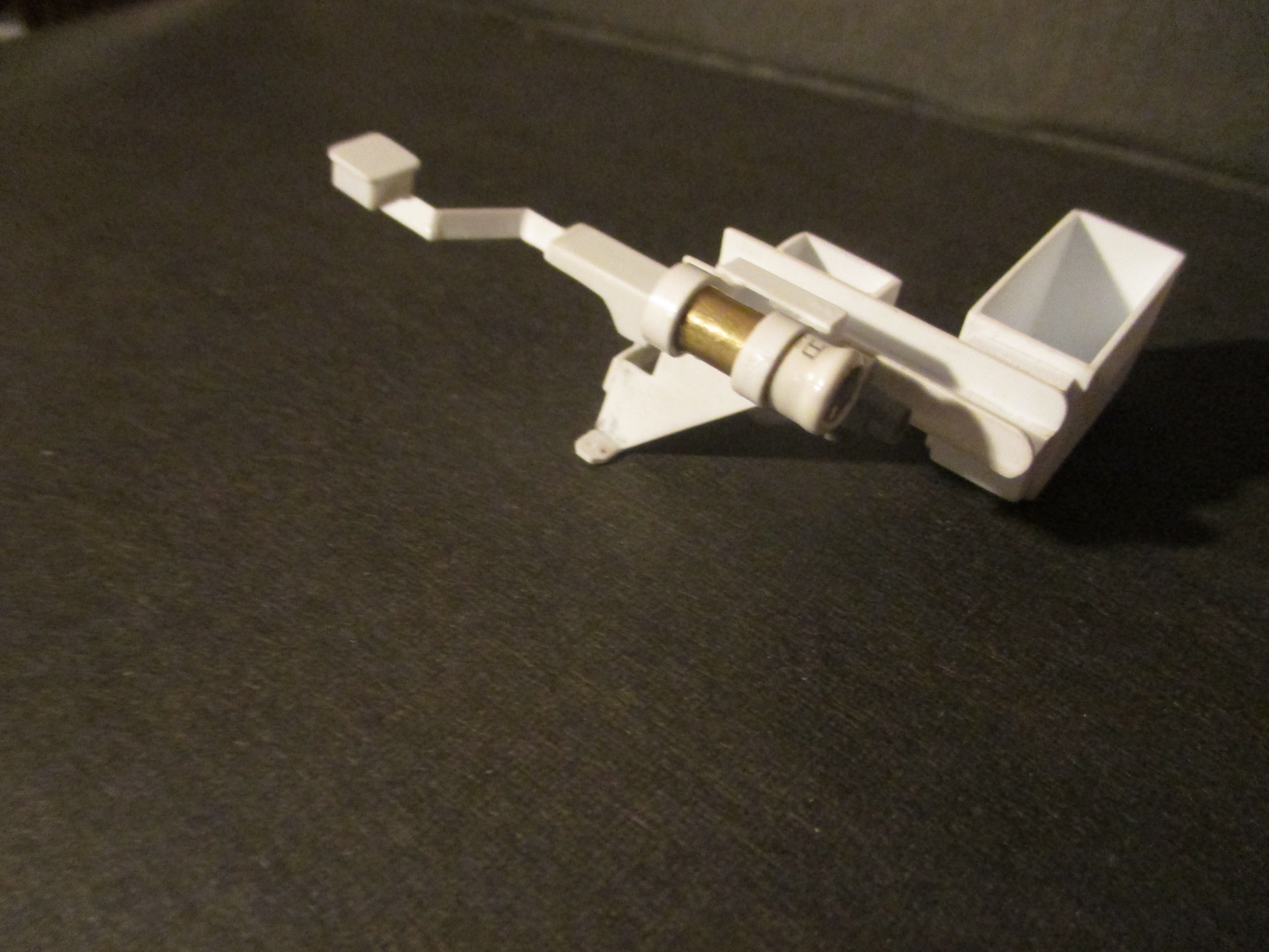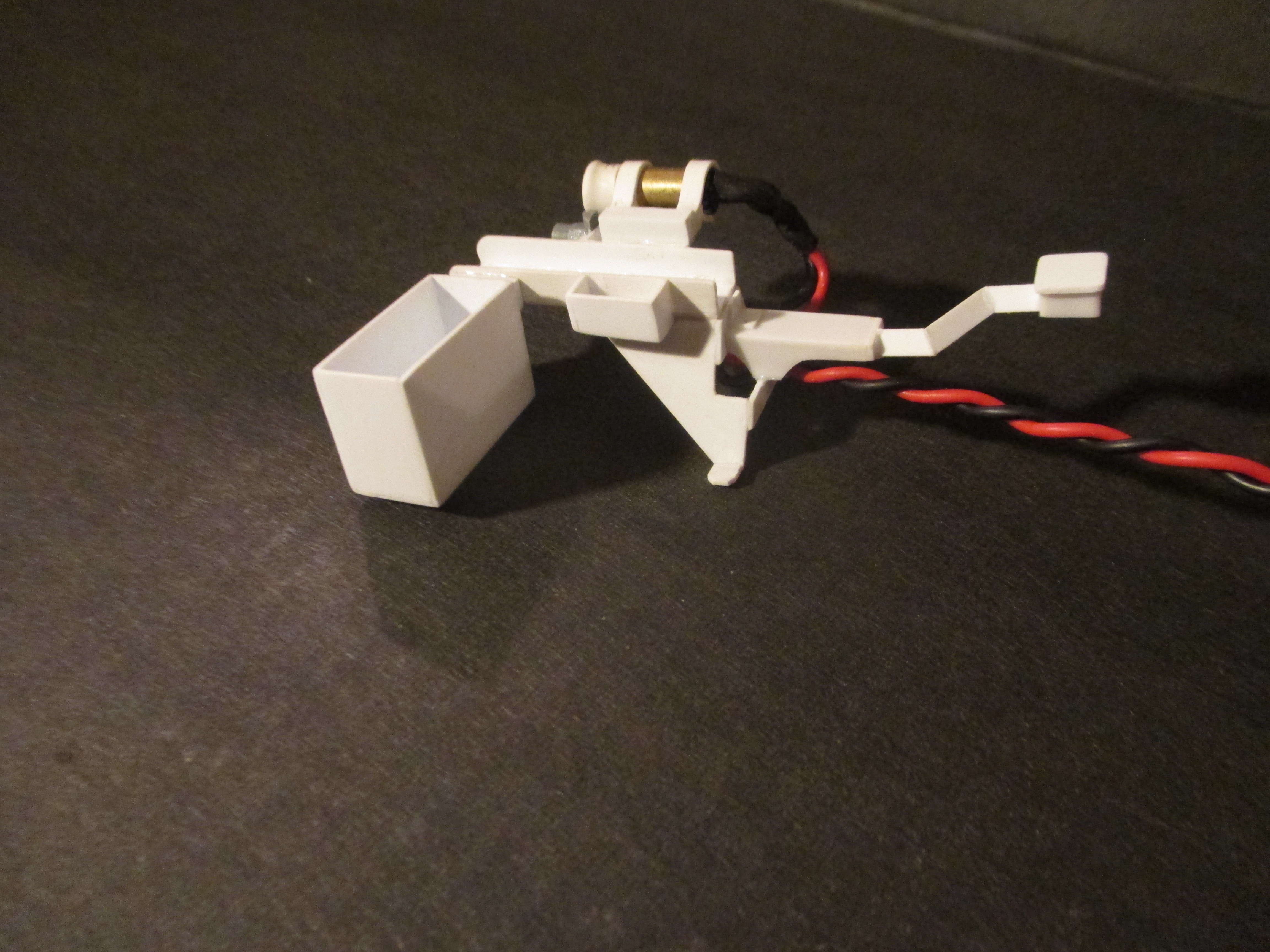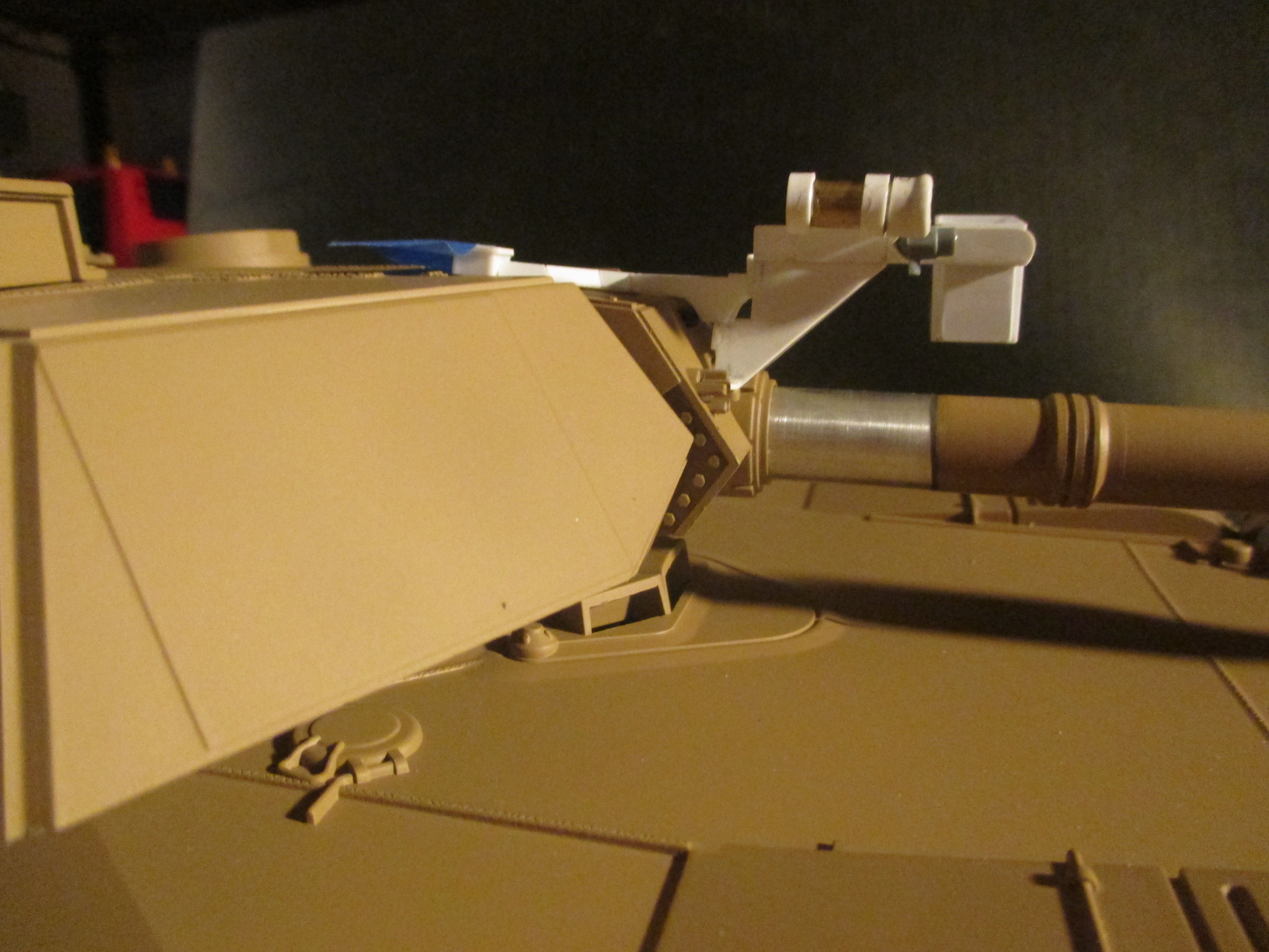 This weekend I put this together. It's a 50. cal mount for the extra .50 that some Abrams have mounted on the mantle. I just got an Abrams fixed up by Dan at Battle Armor and the IR emitter is mounted in the mantel just above the gun tube. I wanted something a bit more cool looking than that so I scratch built this machine gun mount to cover the LED plug and show a bit more pzazz. I cut all the parts to eye just looking at photographs of real ones. I put the IR LED in the place where the spotlight is on the real tanks. Just like the real ones, the .50 cal can ride in the mount, or not, but the IR LED is always ready to shoot. It was a fun build.