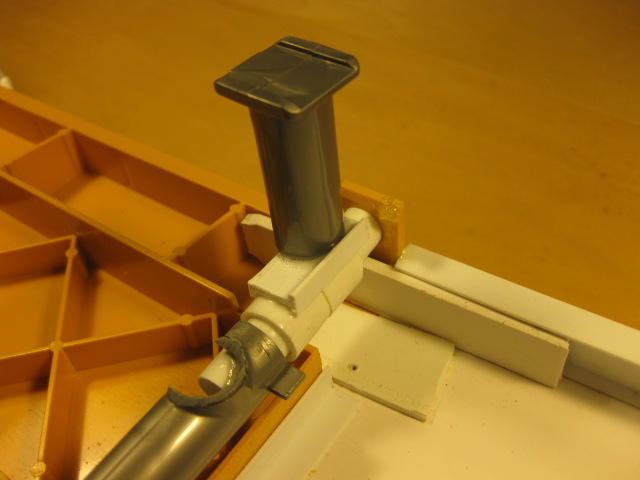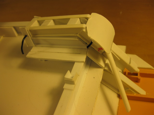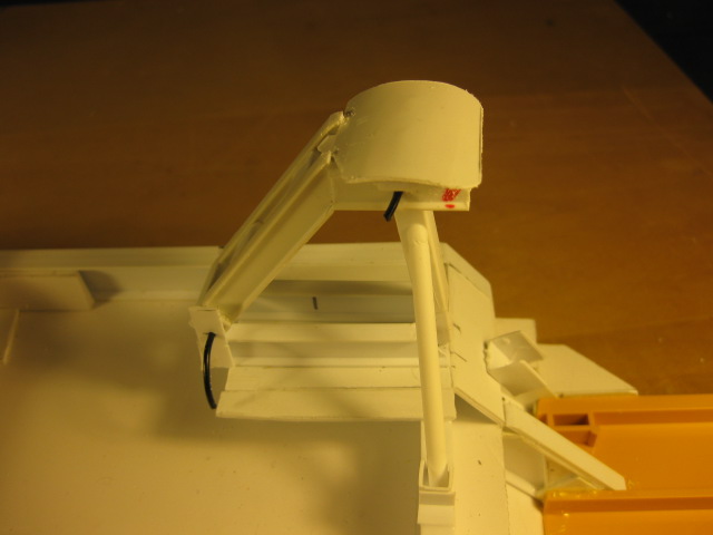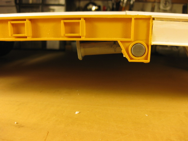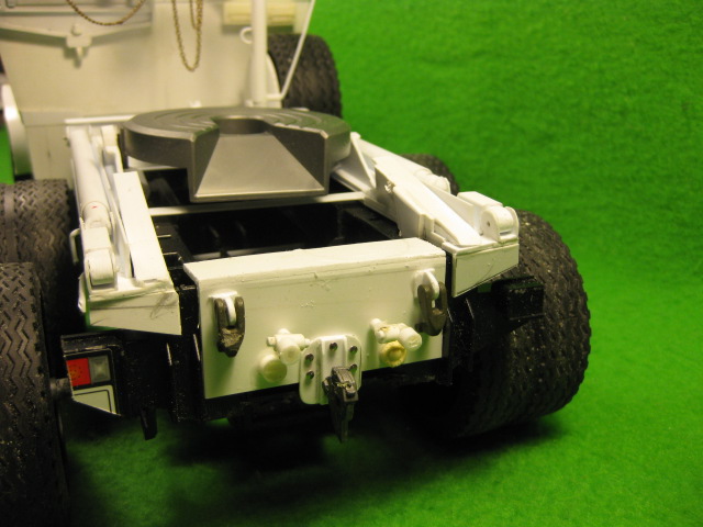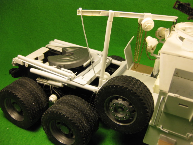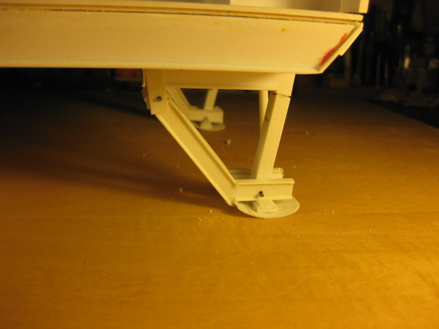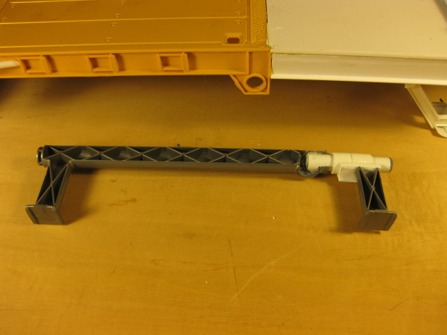 When I made the Bruder trailer longer and wider I just figured I would reuse the support frame that would swing down to keep it level when it was not coupled to the tractor. I widened that item with some plastic parts and figured that it was a done deal. But it didn't look right so I built the folding support rig that was more like the real one, and was in the correct position up forward ---- not in the middle of the trailer bed.