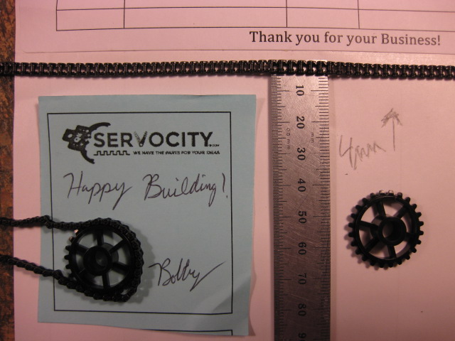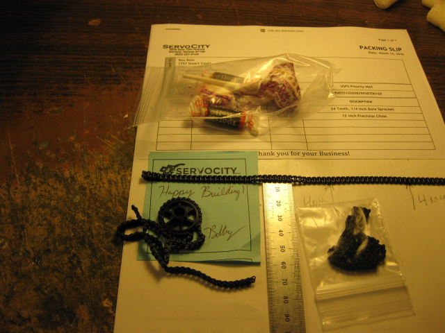 I got the chain for my M26 this afternoon. When I opened the box I felt like a kid on Christmas morning. The chain and sprockets I got are the perfect size for a 1/16 scale M26. I couldn't be happier about this. The chain is 4 mm wide and not flimsy or delicate because of it's size. Included in the box of parts was a plastic bag with 4 pieces of candy and a note from "Bobby". Do these guys know how to treat a customer or what????? They made my day and have a customer for life. Thanks again for this source of goodies.