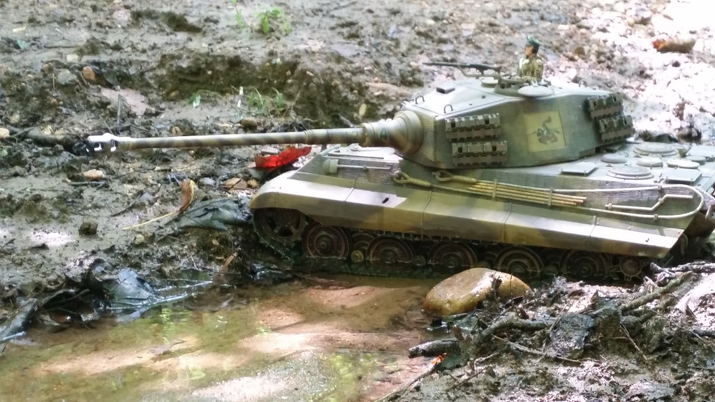 Ok time for some build details. It stated life as a metal version Taigen tank from IMEX but soon after purchased a Torro lower hull, replaced the stock gearboxes with IMEX full bearing 4.1 steel gearboxes with JP480 high torque motors. Electronics are IBU2 with amp card in a custom made case to keep water away. Sound is from 4 Mato speakers, 2 in the turret and 2 under the rear of the engine deck. 5800mah lipo battery, modded TARR MKII smoker, I changed the turret from the Porsche to Henchel and up graded the upper hull to having all opening metal Torro hatches. The zim coating is from Atek, the cables are from Aber as are the gun cleaning rods. It bow machine gun is from rctanks.de as is the stencil kit used for the painting, there are no stickers or decals on this tank its all paint. Aber engine deck armor kit is also used. This tank weighs in at just over 22lbs and will go any where! While I have added detailing bits some store bought and some made by me this tank, along with all of my others, are built to run outside, live through any type terrain and keep going. IMHO this is how these tanks should be built, just like the real things!