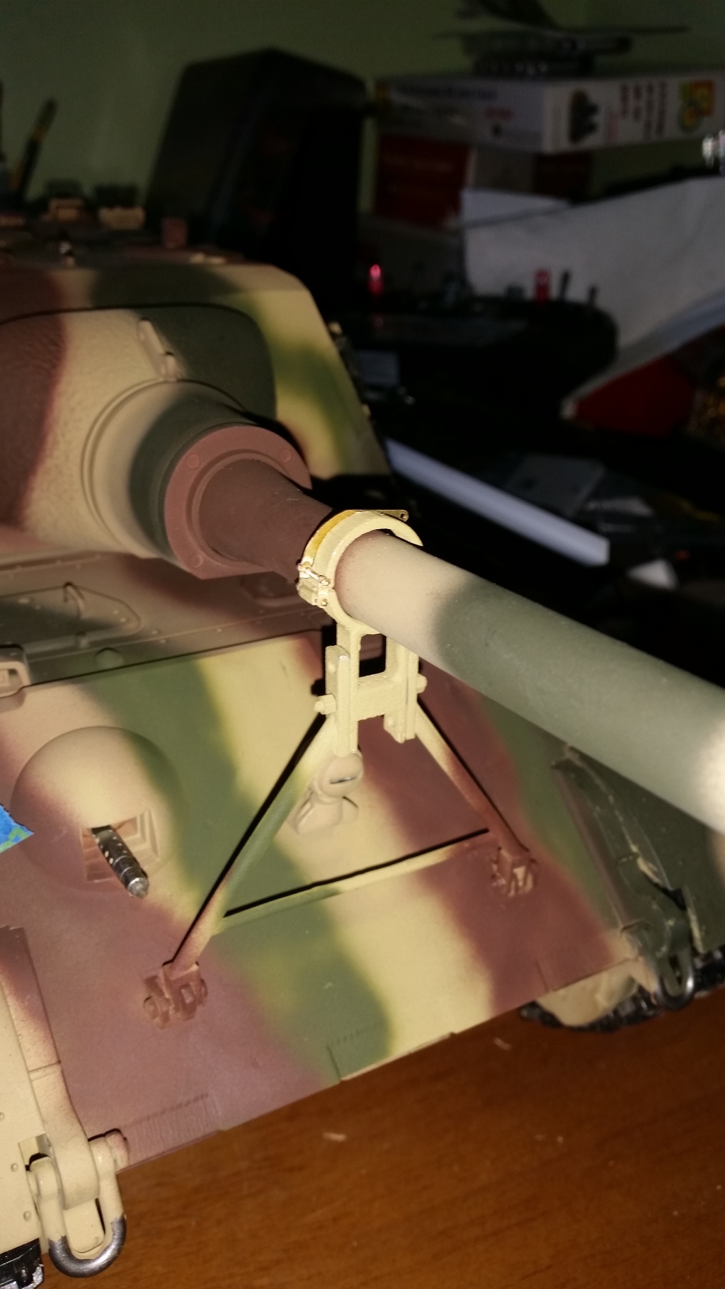 Now you might notice sitting next to my King Tiger is a brand new IMEX Jagdtiger, a VERY nice tank straight out of the box buuuuuut they can always be better IMHO. So with this mindset the first I HAD to do was make the gun travel lock fully functional as lets face it this tank is nothing but the gun so it should be detailed properly. A quick parcel from my German friend Mr.Ludwig and a functional gun travel lock kit was installed. The electronics were replaced in favor of the new IBU3 set up and the motors were replaced with JP480 high torque motors. Another modded TARR smoker resides inside and smokes up the neighborhood with wonderful smelling vanilla megasteam. Sound comes from a pair of Mato speakers though I'm trying to build a speaker box so use larger speakers. Power on this beast comes from a 7800mah lipo. Rear mudflaps are metal ones from rctanks.de and hinged so they move rather then just fall off as the stock ones do, I used the same set up on my King Tiger.