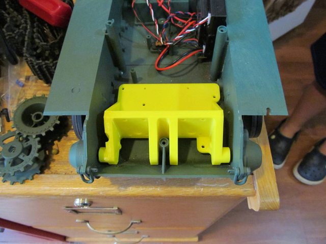 I've only got one motor wired up right now, but it runs. The speed seems good - slower than stock but stock was too fast anyway. The motor is supposedly 200 RPM out at 12V. I'm guessing this is a bit slower at tank voltage. Torque seems a bit light though when I grab the drive sprocket. I may have to investigate a more torqey motor. But I won't know for sure until I get the tank all together and test drive it.