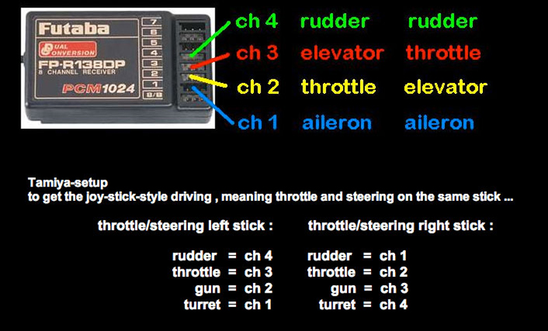 Tamiya on the other hand, would have you mixing it such that your left stick controls forward and backward as well as turret traverse, and right stick controls direction and gun elevation.