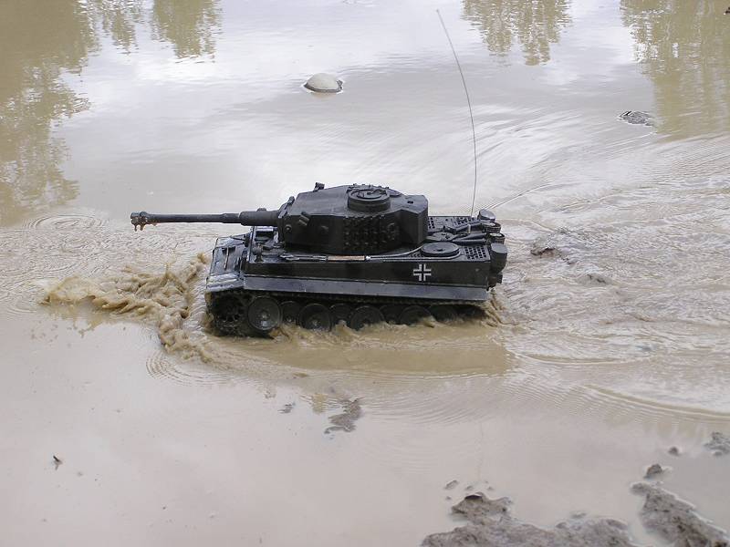 For running in water about as deep as the tank in schutzstaffel's pic, you'd need to relocate the power switch and speaker volume knob to somewhere higher on the tank (as these would let water into the hull) and seal the battery compartment. Then you could put Goop on the miscellaneous openings in the hull such as suspension mounts and the like.