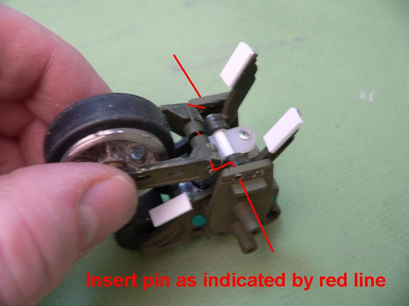 The traction bar assembly is all glued solid except the Du-bru hinge. The hole assembly pivots from there. Notice the engineered plastic pivot bar and how the ends extend past the traction bar assembly. This rides in the C channel that is glued to the inside of the suspension castings.