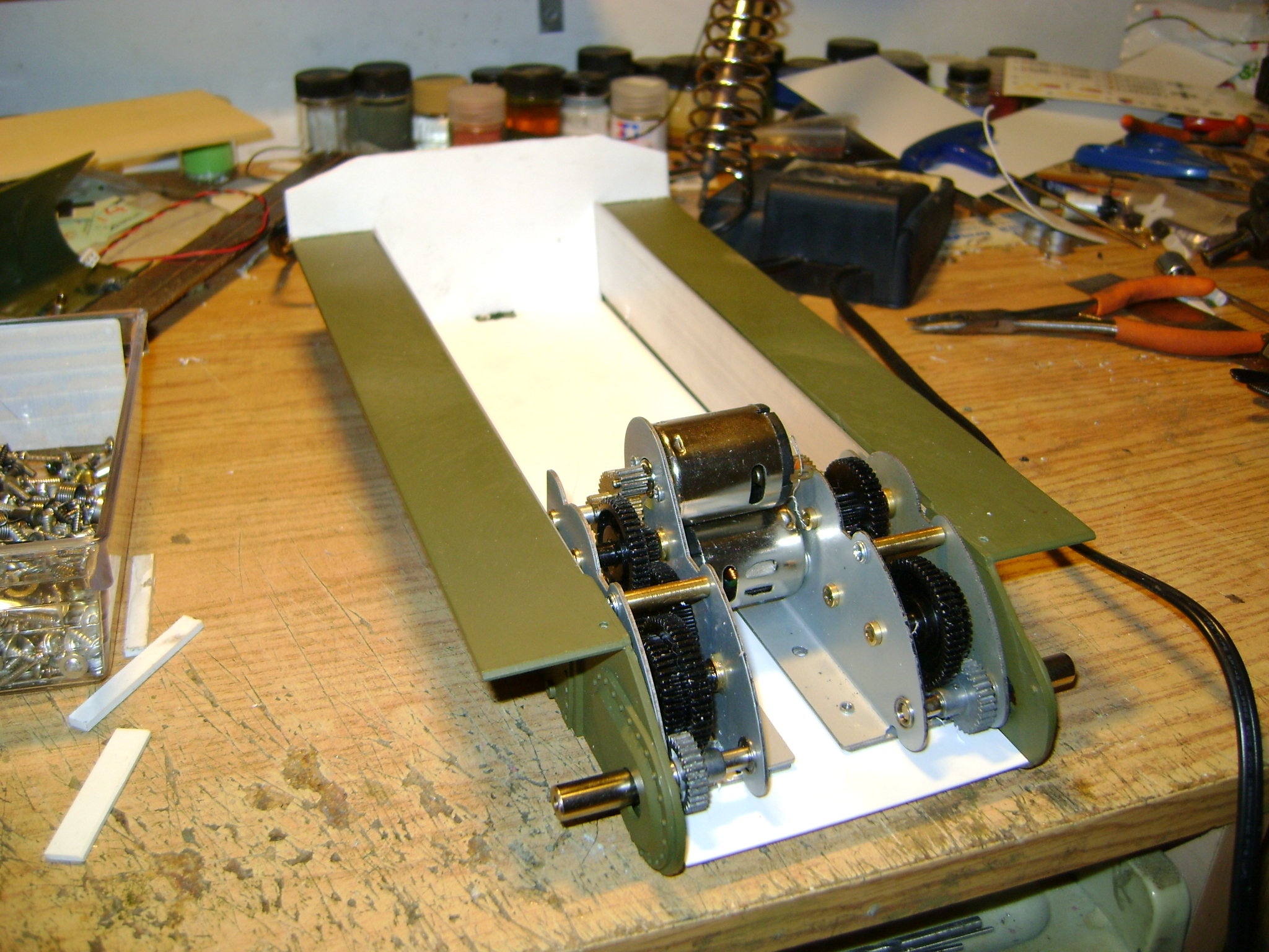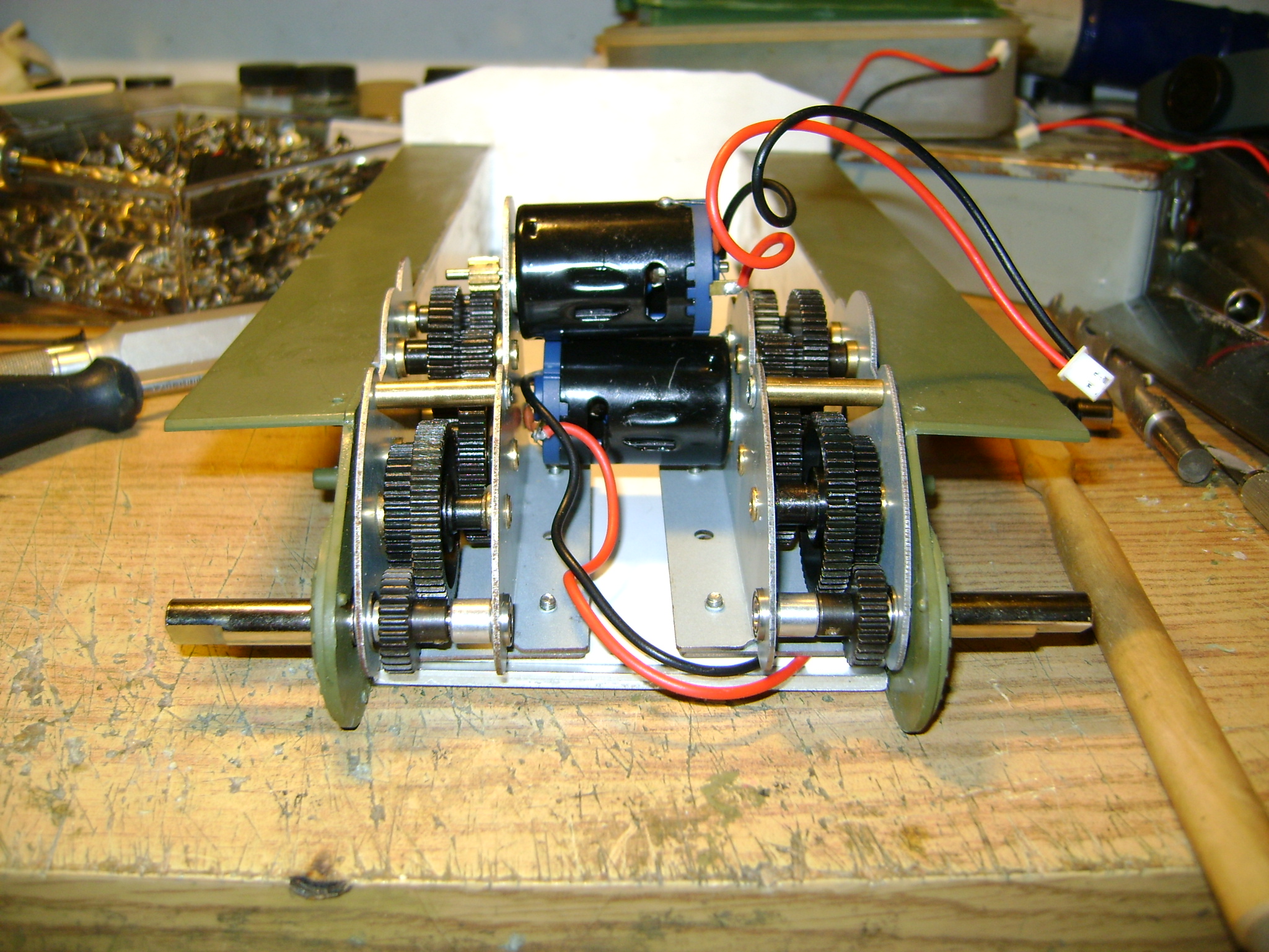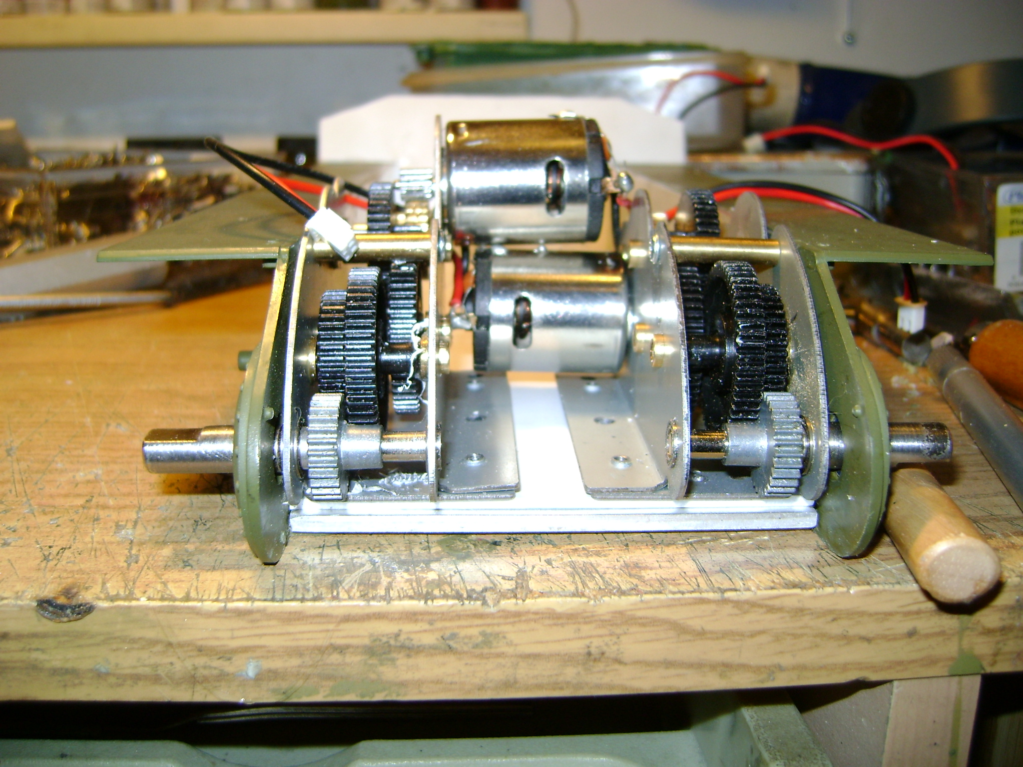 Your right the number is 48mm. don't know where I got 54, I guess I miss fire. The fourth is brass(I don't like for gears) The zinc is all I have at the time. Zinc gear on a small shaft. All the steel gears are on long shafts. Need a press to press the gear off and on the shaft. The Taigen gearboxes was zinc and I switched it out with HL steel. Switched out the motors for the short can for space saving. Normal size cans will fit but it's a we bit too close together. Motor wires too close to the other gearbox.