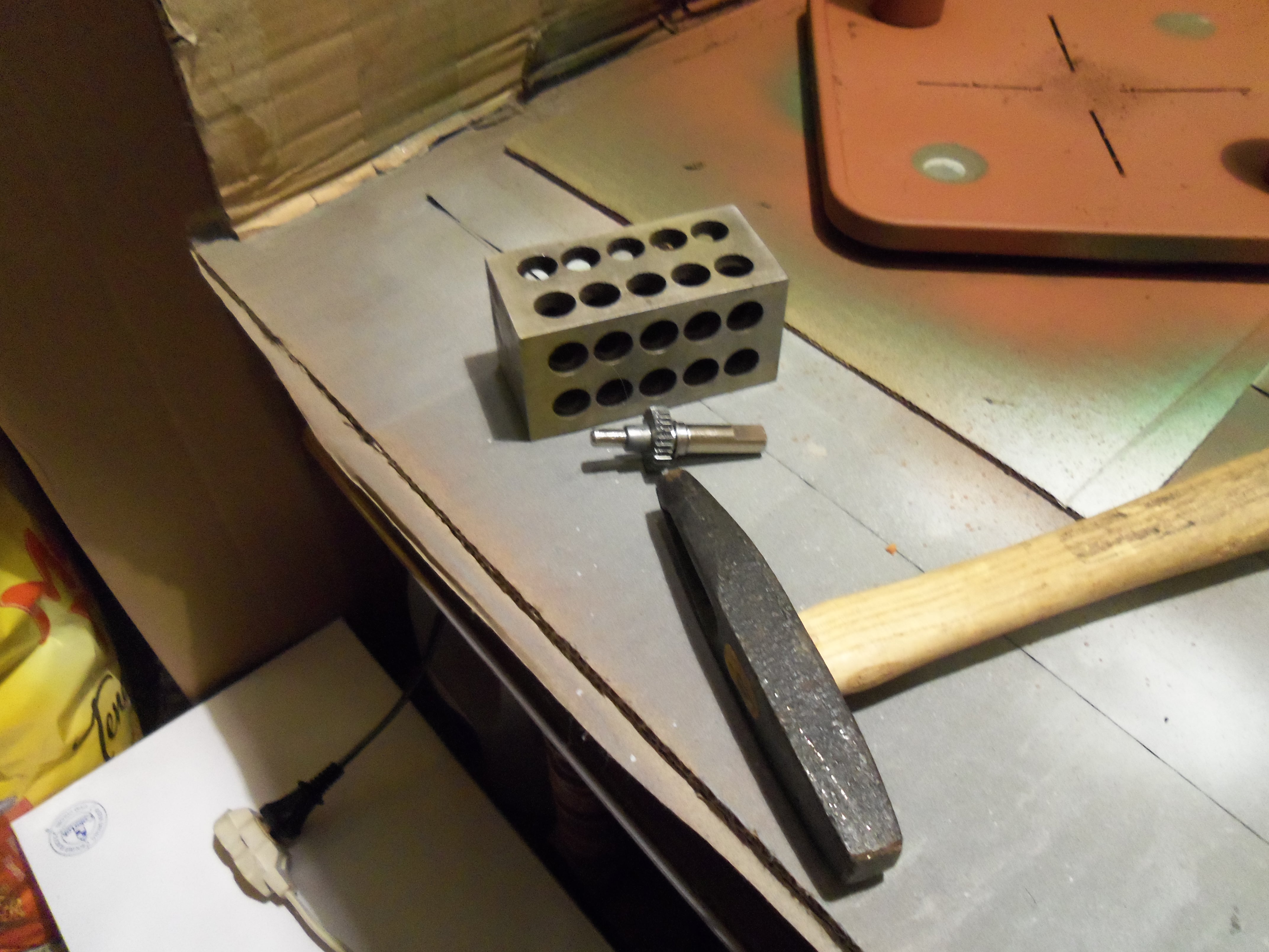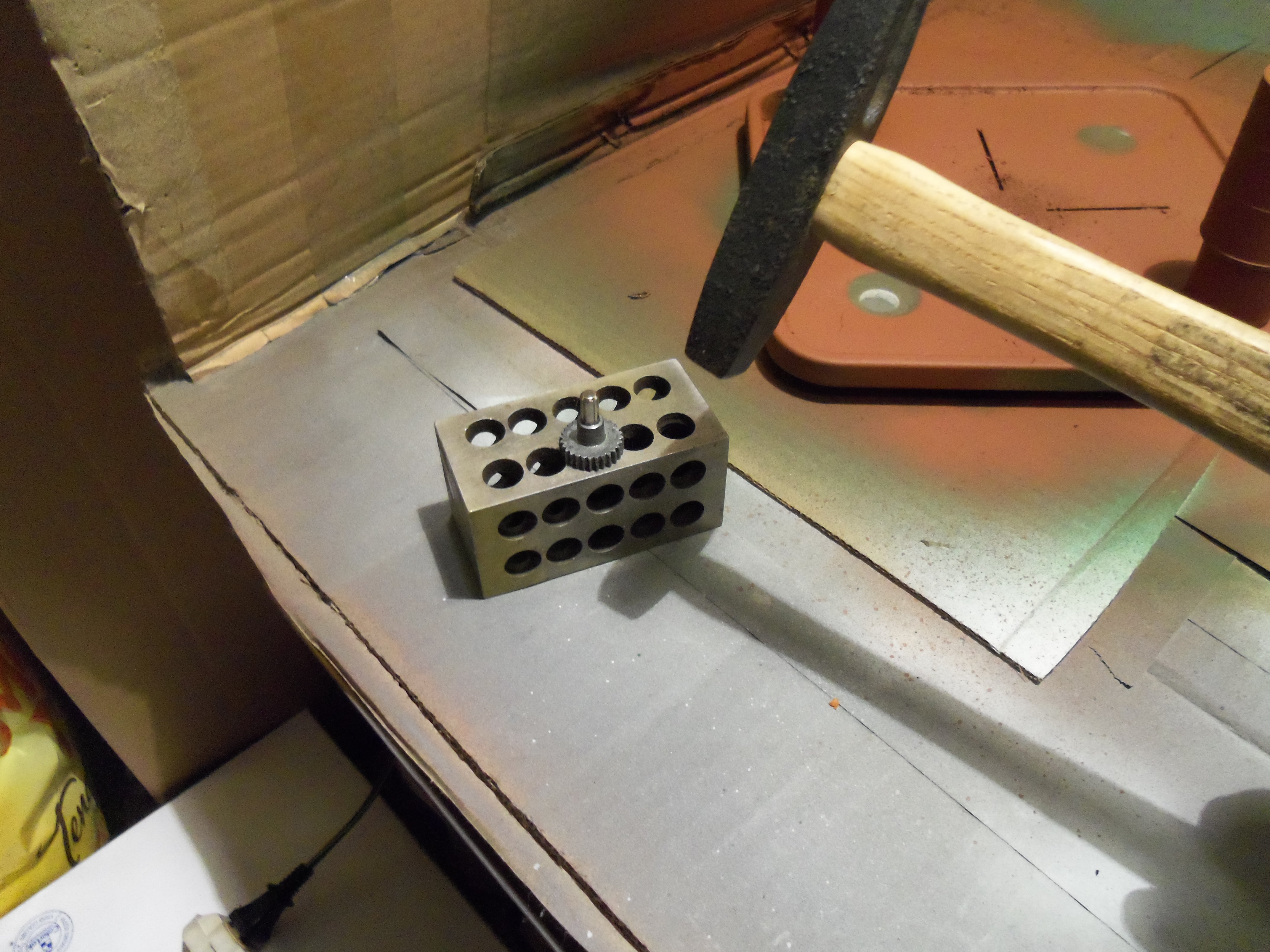 It's good to meet someone else that's working with gearboxes like you are. You don't need a press to remove those gears. Here's what I use. The block is made of steel and is available at any industrial supply store, ask for milling and inspection blocks. They're not very expensive, but you can also make your own with a block of steel and a drill press. I just drop the shaft into the hole and use the small hammer to carefully drive the shaft through the gear and off. The shaft in the photo will get a new gear for the boxes I'm sending to Old Fatman. It will still be zinc, but at least it will be new. :)