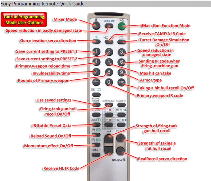 Yep a sheet like that is what I was talking about. As it is a good reference sheet you really only have two options. Memorize it or have it around everytime you want to do something diffeerent on your tank. I understand that it is what we have and at lest we DO have it, It just seems like we could and should have something better. there has to be a better way with the sony remote than one of the two ways i mentioned.