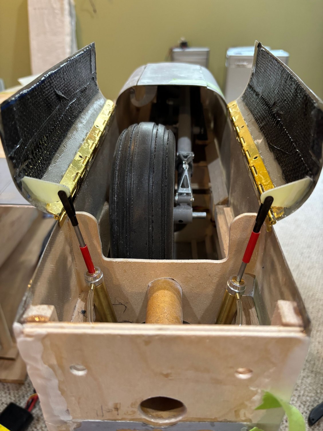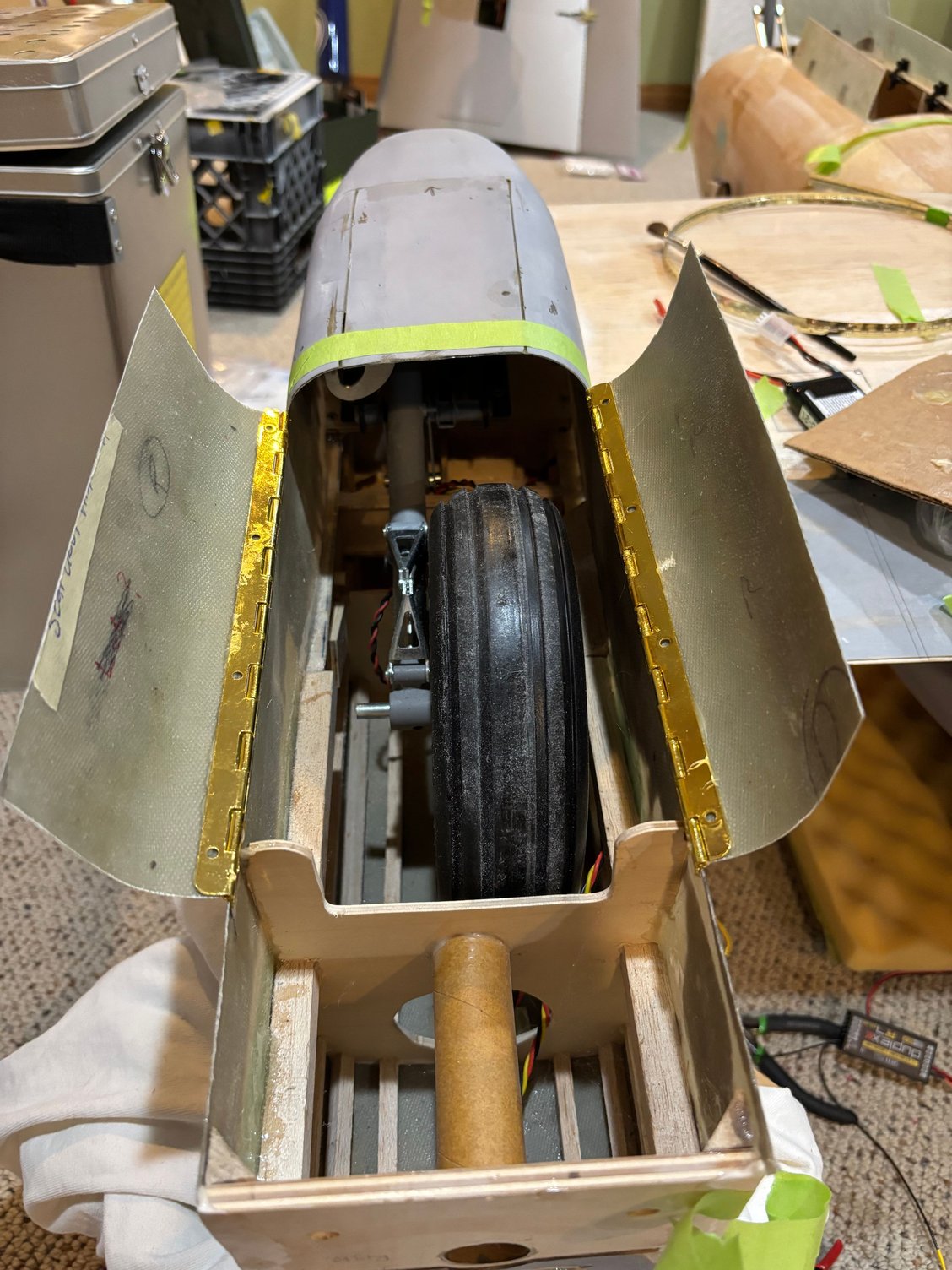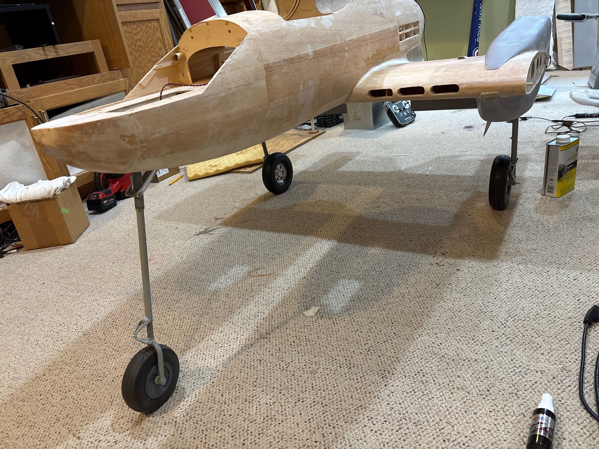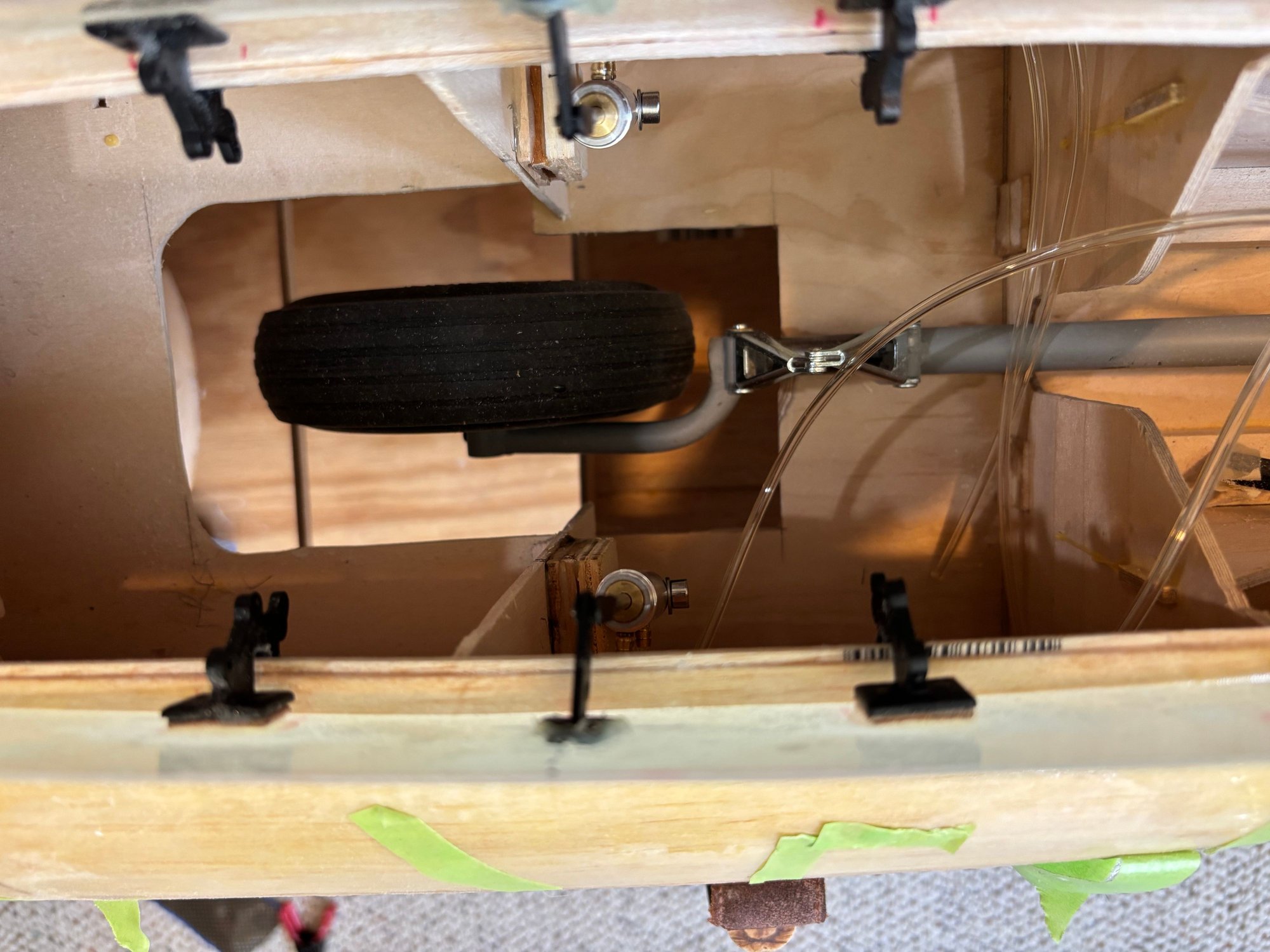 Electric powered motor = 200cc. Custom electric retracts by Robart. 7 and 5 inch wheels respectively on mains and nose. Sound system from Model Sound Inc with 4 inch speakers generating DB605 engine noise