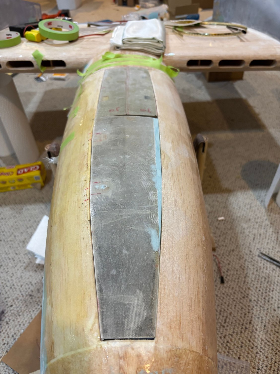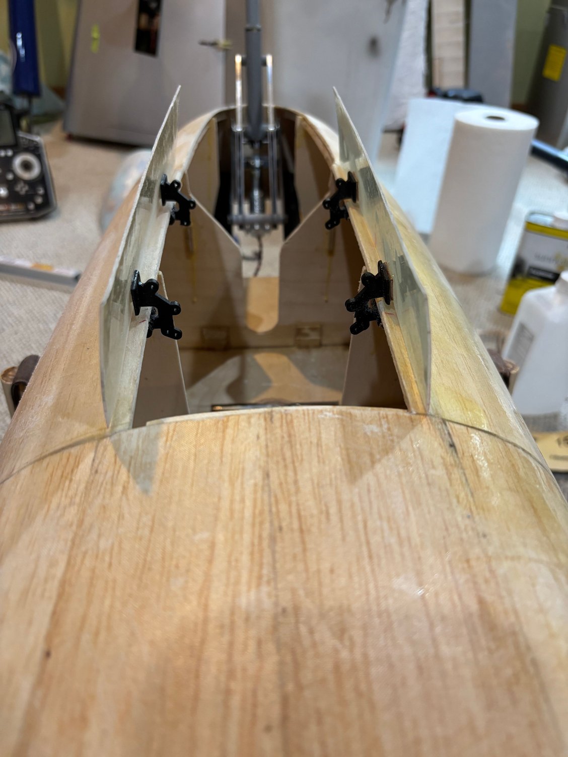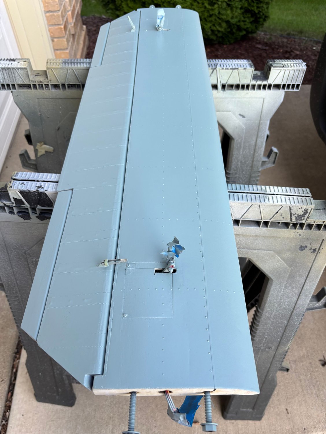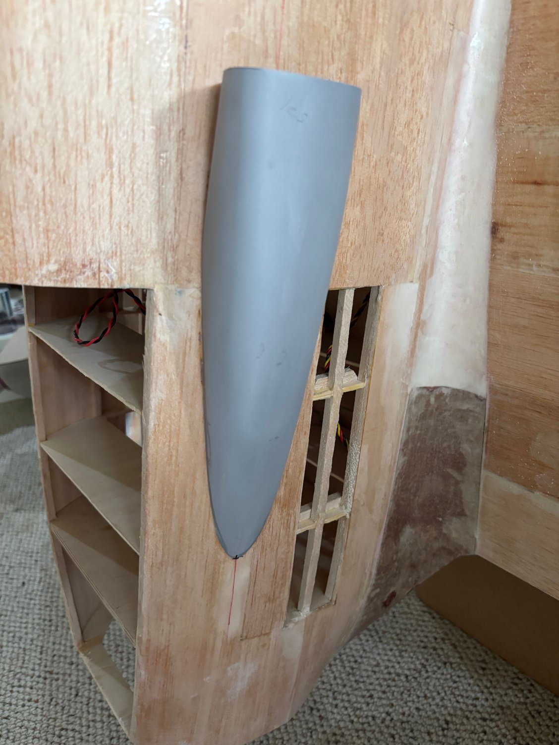 Electric powered motor = 200cc. Custom electric retracts by Robart. 7 and 5 inch wheels respectively on mains and nose. Sound system from Model Sound Inc with 4 inch speakers generating DB605 engine noise