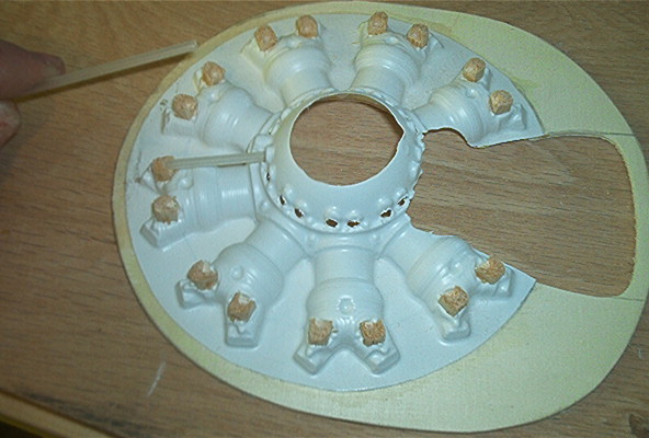 Now here is what I did, not only did I go with the cheesy engine but I went with extra cheese! Just the way I like it! I glued the engine to the lite ply and added some CA and Micro-Balloons to the inside. Also I added a balsa ring to the crank case for extra support.