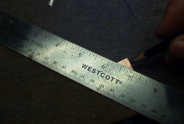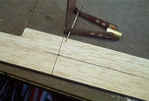 Draw a cross on a ¼” sheet of hard balsa to make the jig for the fork alignment. Also mark the center of the back plate.