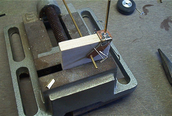 Soldering the axle support bearings on can be very difficult or you can make it easy by constructing a simple jig. I used some scrap balsa sanded to the proper angle that the forks need to be at to be soldered to the brass tube. Use pins through the mounting holes to hold it in place.