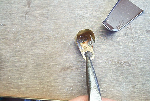 Now when you lay the small brass angle piece on the solder and touch it with your soldering iron the solder will melt and pull the piece to the parts. Then hit the outer surface with some solder.