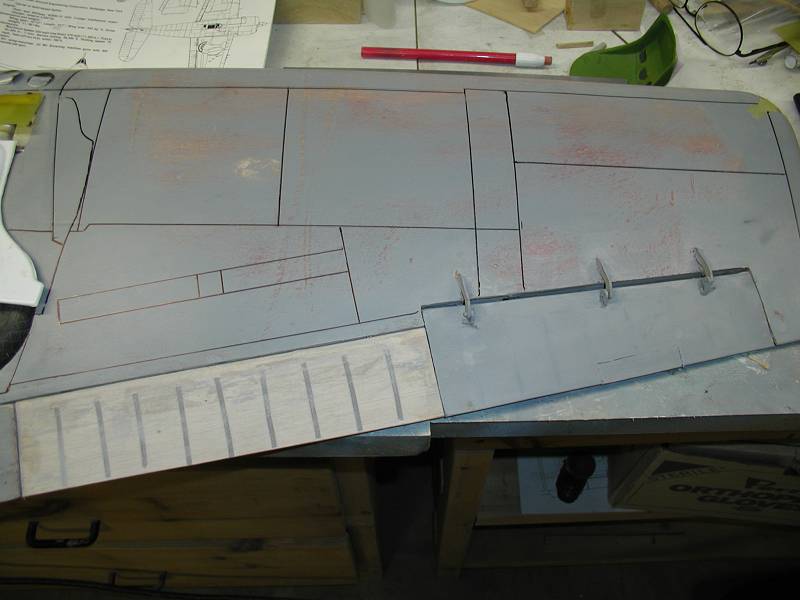 I have the second tailwheel done and now I am working on the wings. I have marked the position of the panel lines by multiplying the drawings in the Squadron Signal book by 9. I am using aluminum tape for the hatches/inspection panels. I will be laying down 1/64"chart tape to simulate the panel joints. The tape will be removed after a couple of coats of primer.