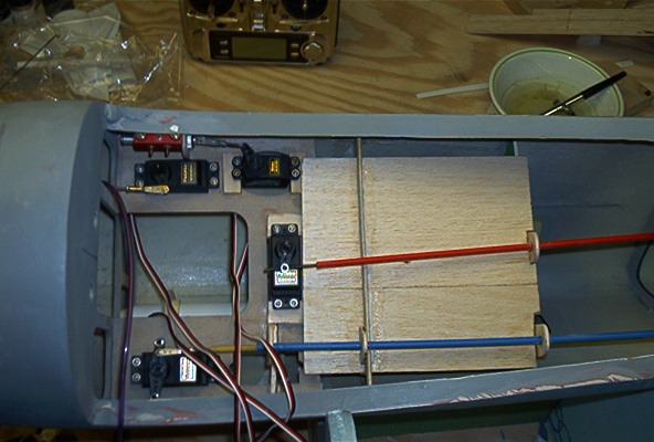 I wanted to show my radio installation so you all can see how it looks with the cockpit floor installed. By the way you must install the cockpit floor before you hook up your control surfaces! The only modification to the stock servo tray I made was the addition of a few ¼” ply plates under my elevator servo so that the pushrod could clear the cockpit floor. This thing has got plenty of room in the fuselage, it’s very easy to keep everything ahead of the CG. I installed the CJ air tank above the fuel tank. The fuel tank and air cylinder for the tail wheel is not installed yet. I did remove the tail wheel so that I could hook the control rod to it though. This was easily done through the removed tail cone hatch with an 8” screw driver.