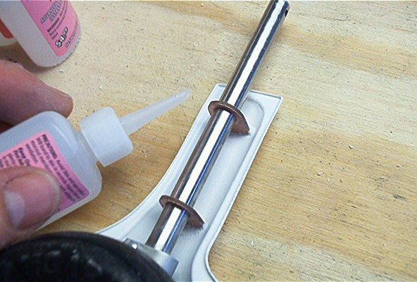 For those that want a more scale gear door retainer you can use PC board. I’m using the CJ gear so the struts are ½”. Drill 4 holes in your PC board with enough around the sides to work with. I used a template for the top and bottom door retainers, mark them off and sand the PC board parts down with a disk sander. Remove your struts from the gear and measure as shown from the top of the scissors. For the bottom retainer measure 5/8” up and for the top one measure 2 5/16” up. They will be a tight fit so no glue or anything is needed, also the paint will help to hold them in place. Glue the doors on with thin CA and dash the wet glue with some Micro-Balloons. If the doors ever need to be replaced I’ll just pop it off and glue on another one. Mask and primer, then paint!