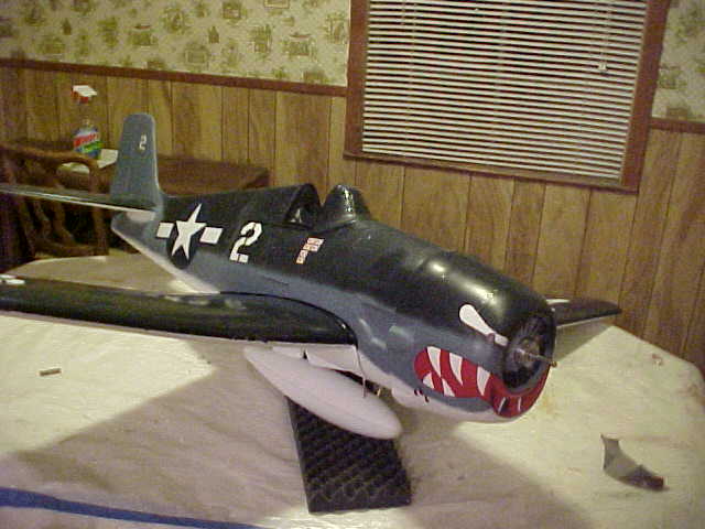 Aero D, Yes used Model Masters Dark Sea Blue on top then Intermediate Blue in the middle with Rustoleum flat white on the bottom. Don't know on the fuel proof part I have always cleared mine after it was all done. Now on the covering I stripped mine all off and glassed it plus did a lot of mods like take 6" out of the middle to make it more scale, like Luke has shown us way back in this thread. This is the second one of these Hellcats I have built so if you are wanting to use the stock covering and it is cloth then it will hold up and it is worth painting. Now if it is a clear plastic film that was then painted it sucks. This was what my first one had for covering but this one came with fabric covering. On clear you can use Top Flite Lustre Kote flat clear with good results which I have done before. I now use Dupont automotive paint that is flat.