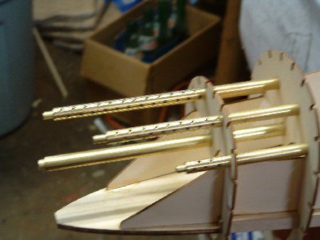 Remember to drill the holes in a staggered pattern like a checker board. I use a tubing cutter to cut the barrels off and this will slightly roll the outer edge of the two smaller pieces of tube that make up the barrel and it looks very scale because it adds to the thickness of the barrel inside the cooling tube. Cut the barrel tubes at the same time one inside the other. On the cannon which is the center gun I flare the tip with an aul to give it the right shape of the flash surpressor. Each gun only needs to be two inches long so three 12" pieces of tubing will be enough to make up all five guns.. The aluminum is easier to shape but a lot less durable than the brass tubing. I brush the surfaces of the tubes with the little wire brushin my dremmel tool and wipe them down with alcohol before I paint them. If you use the aluminum tubing you don't have to paint the inner barrel. It will polish up easily and look really good. I paint the outer cooling tubes flat black. Hope this helps.