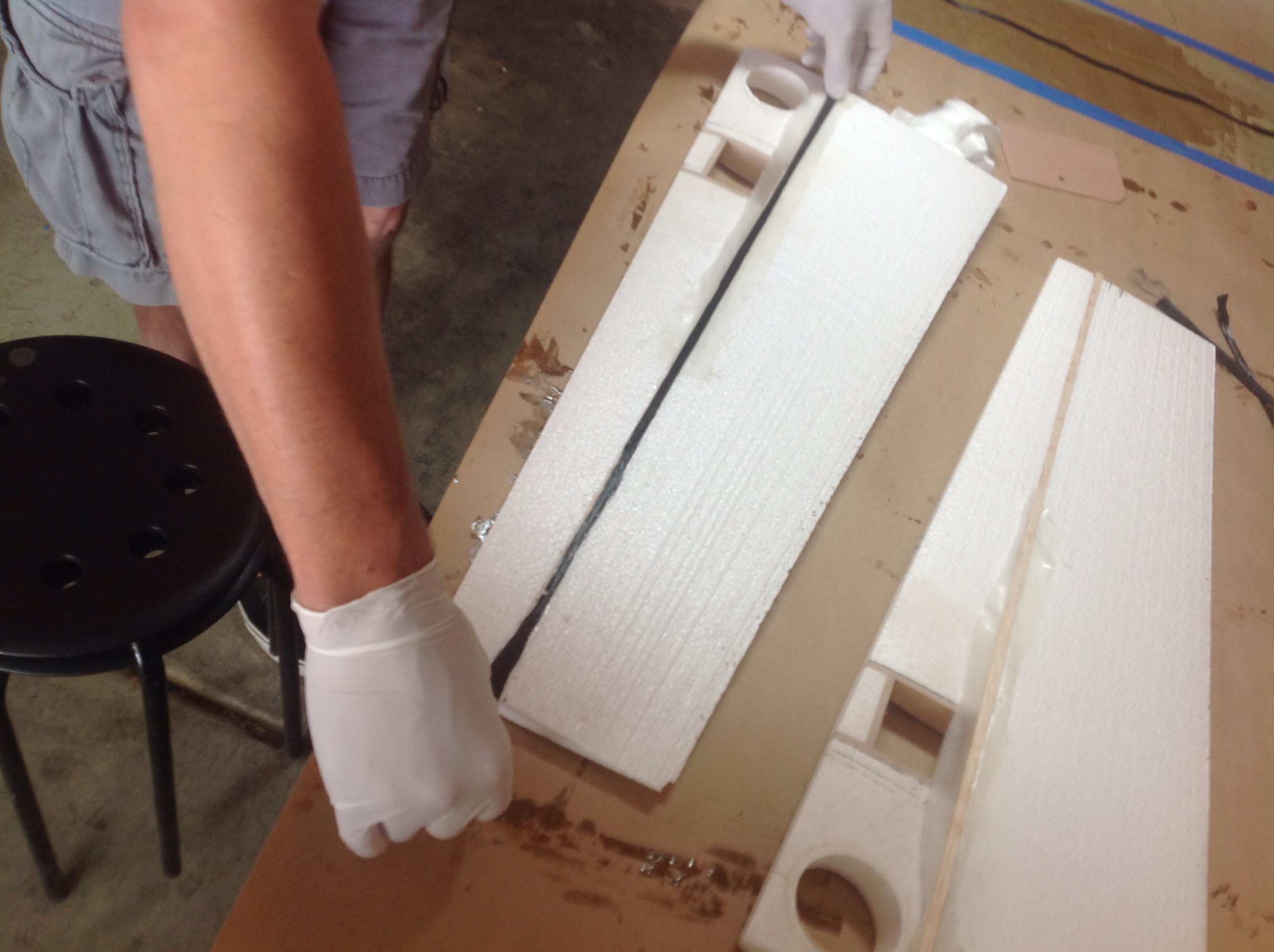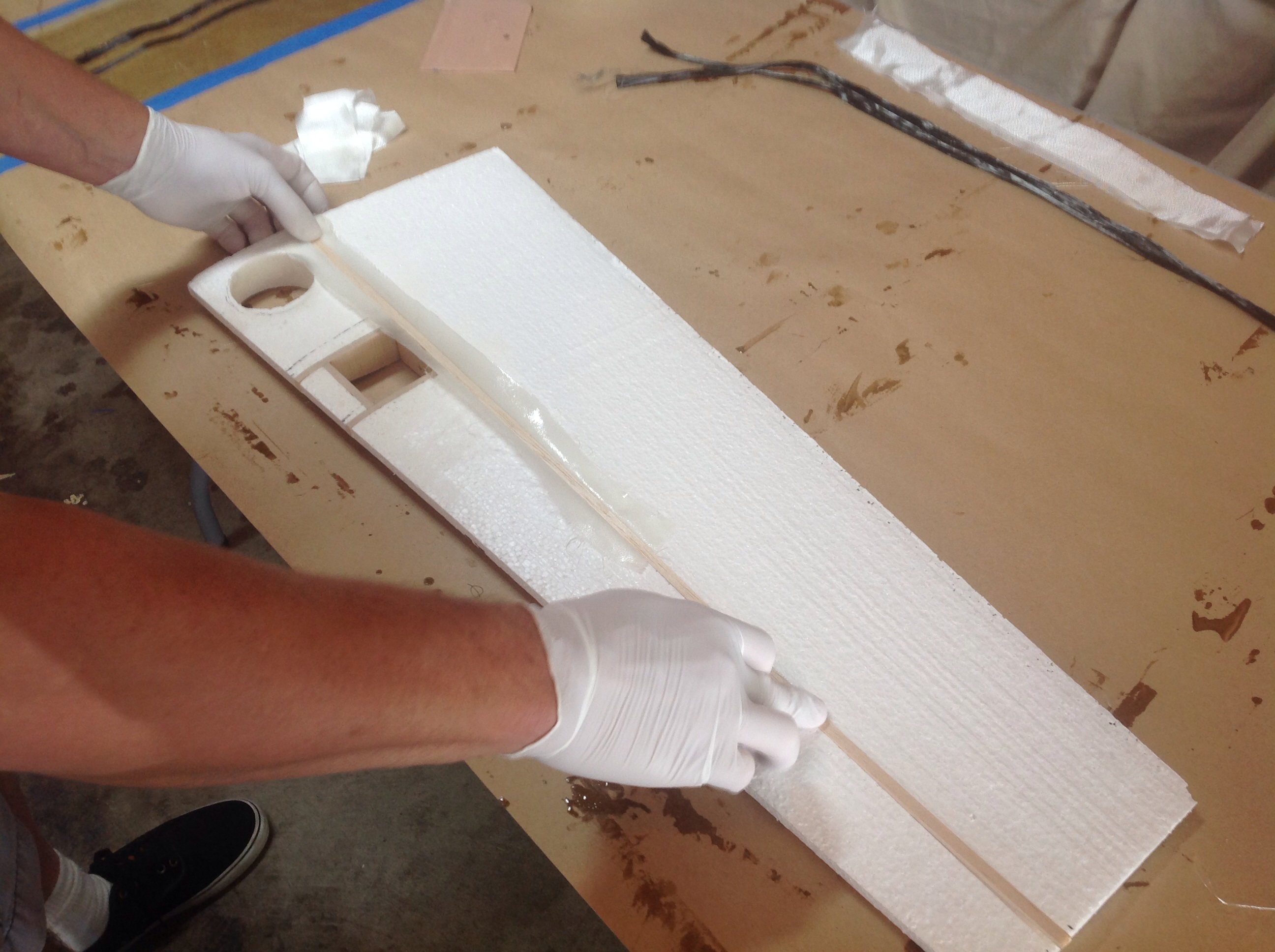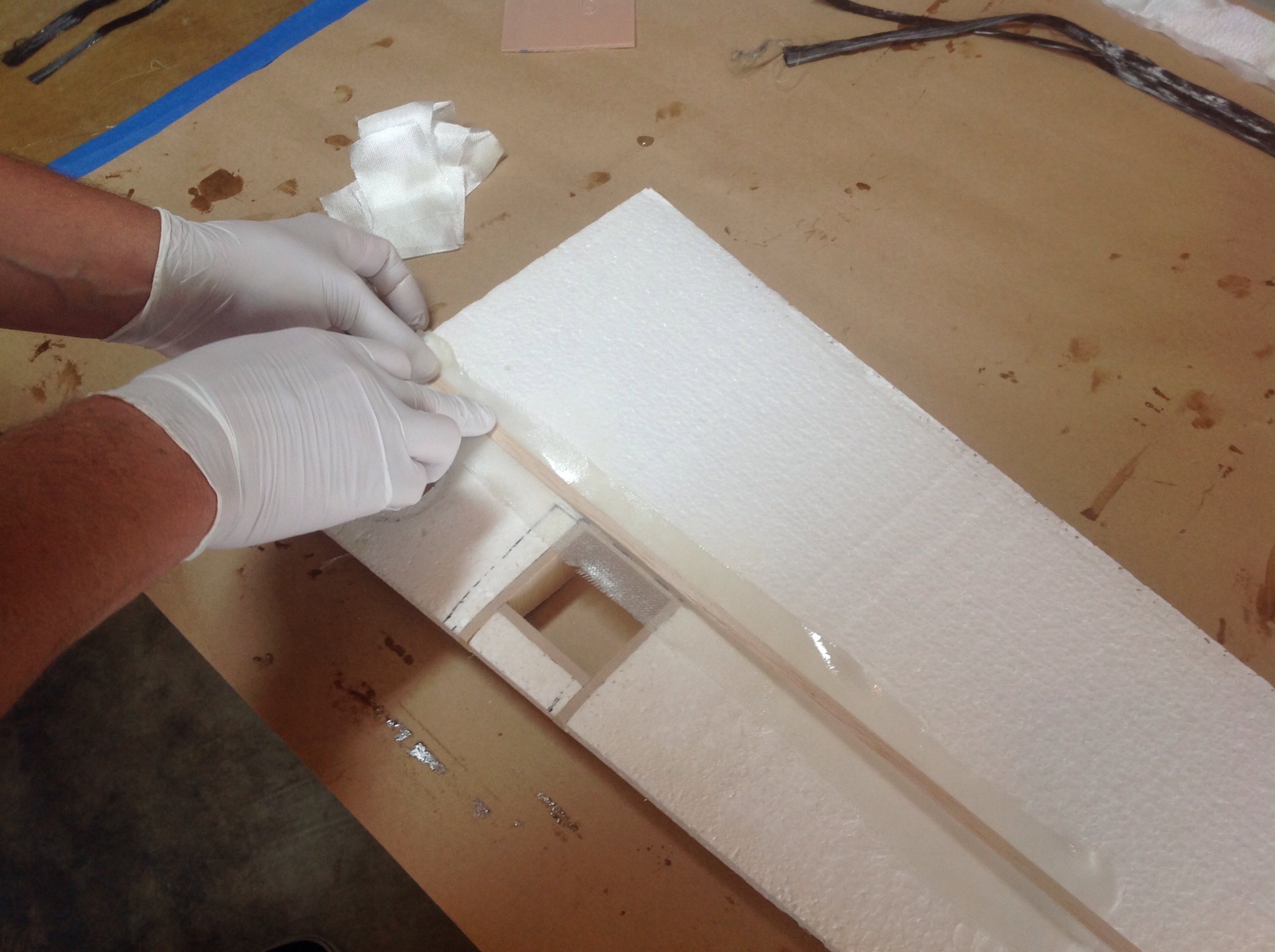The first pictures are of the wing construction. 1 lb white foam with 1/16 sheeting. The spars are 1/8x1/4 balsa that have a glass box and CF caps. Wheel wells are pre done as are the retract mounts. The mounts are a box that ties into the spar. The end user needs only to fabricate a mounting plate to fit the particular retract and then epoxy that plate into the box. The tail section is pre sanded balsa that gets glass bagged.