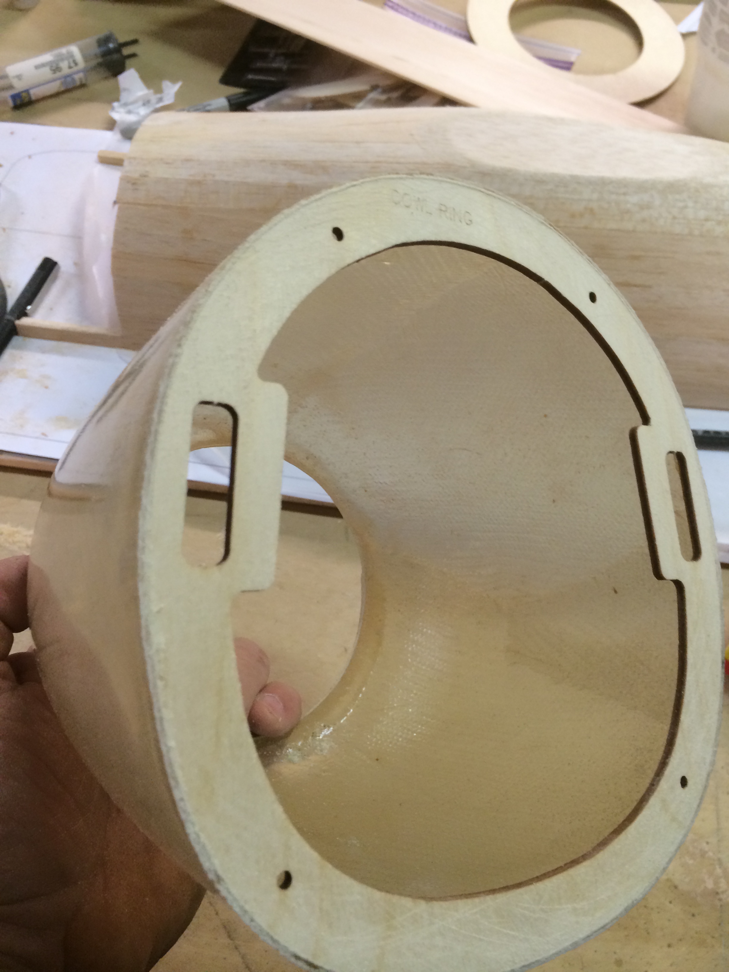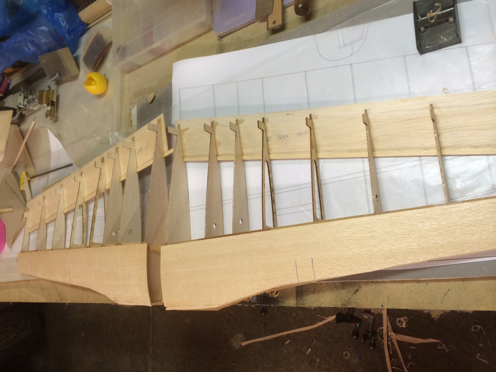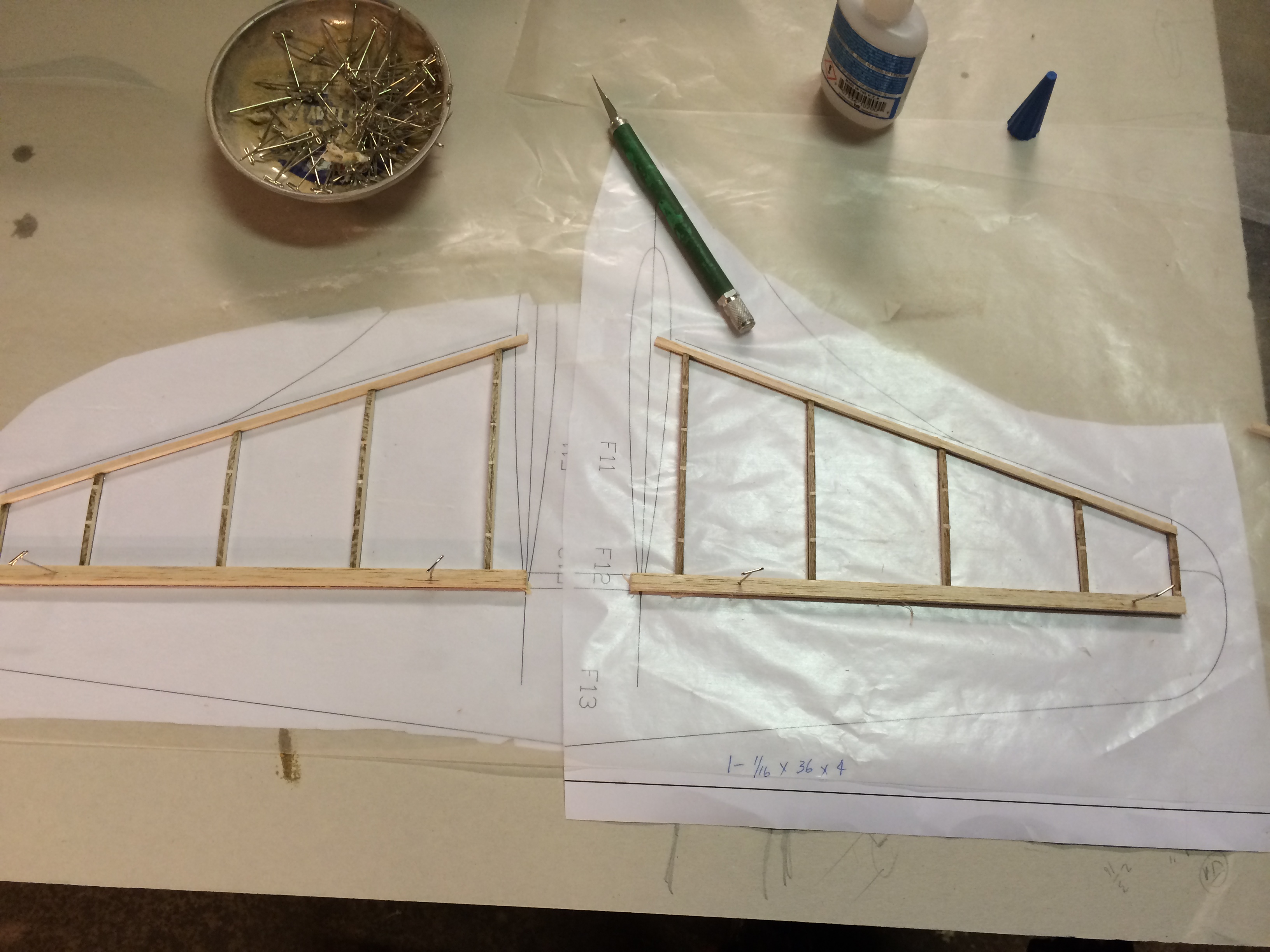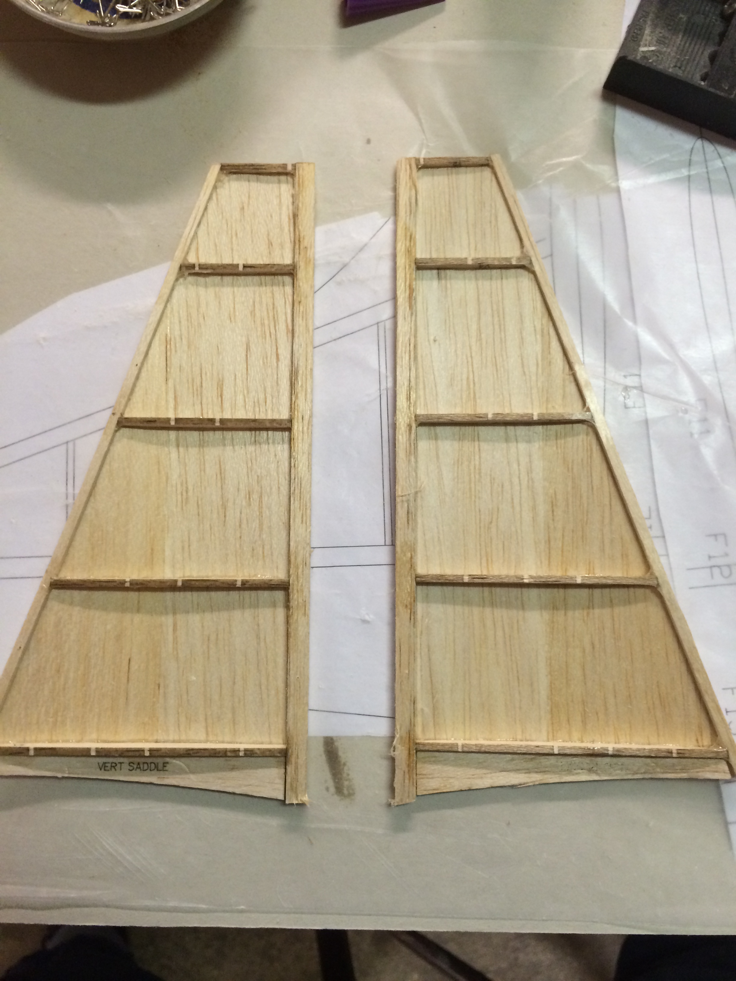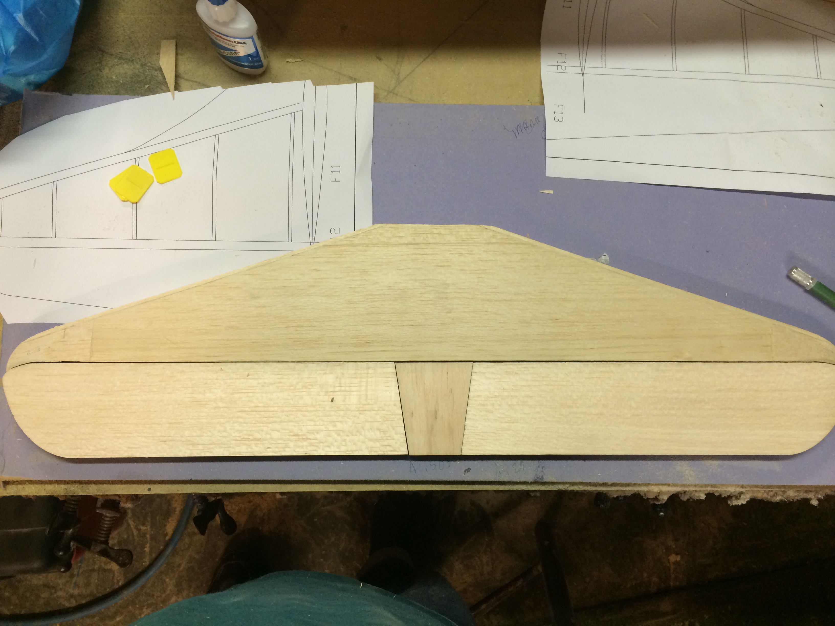 Then following the same procedure as the horizontal. Framed up the two halves, shaped, sheeted and installed the vertical saddles on each half. Cut the excess sheeting, glued the two completed halves together and attached the top tip and leading edge . I will complete the final shaping when the fuselage if framed up.