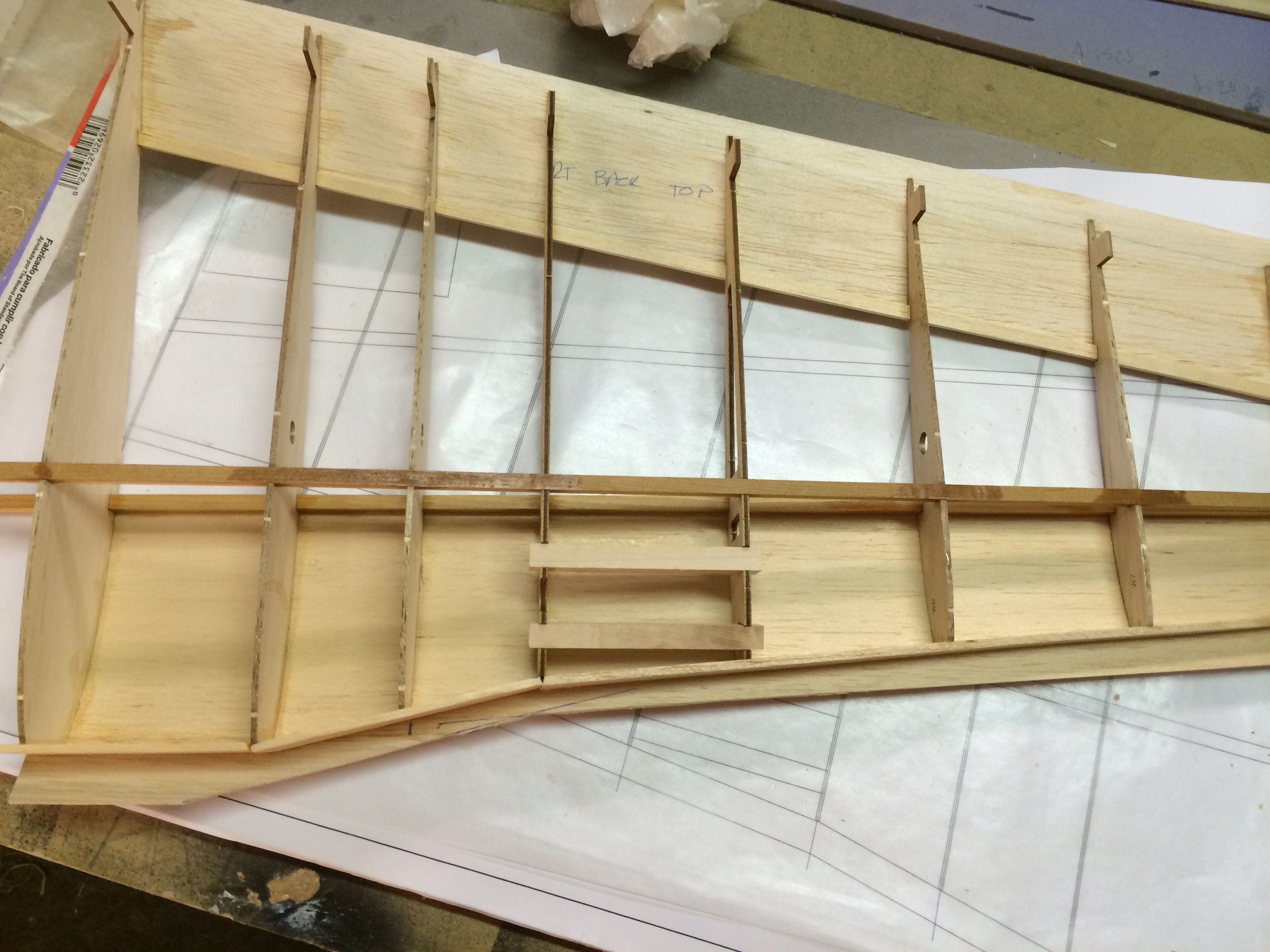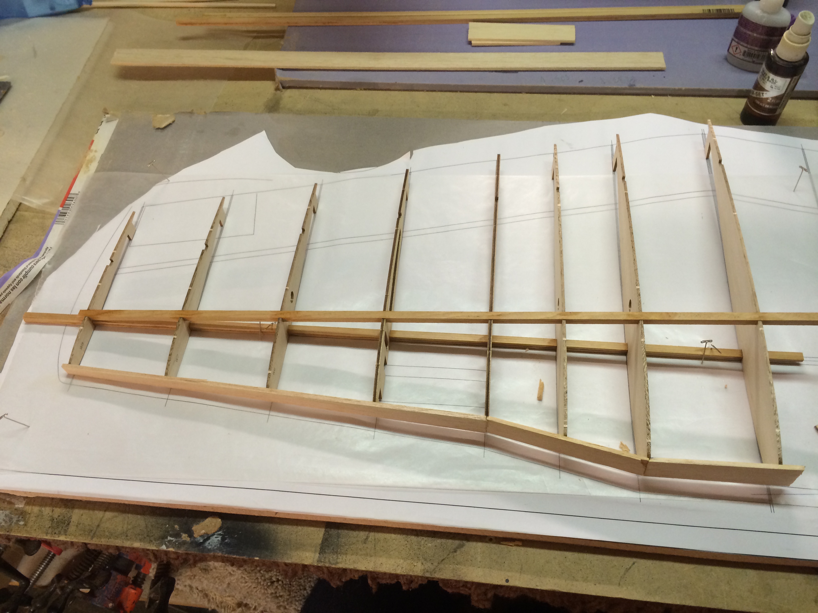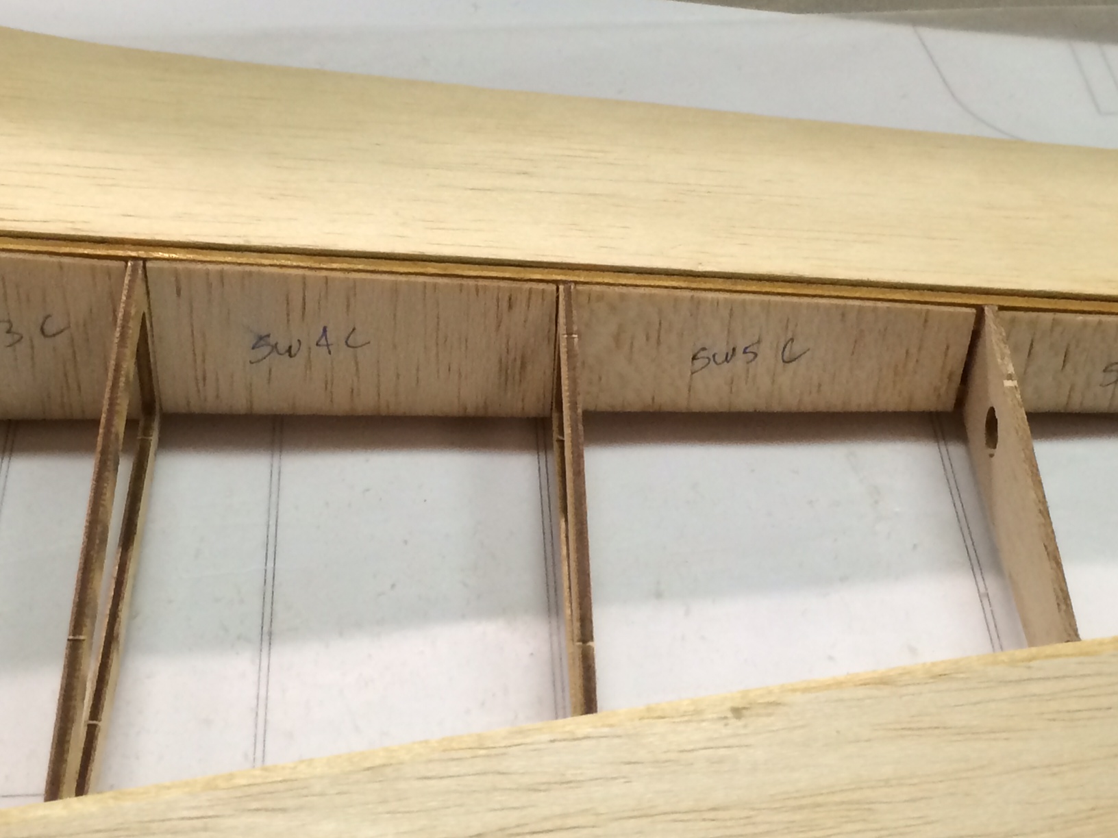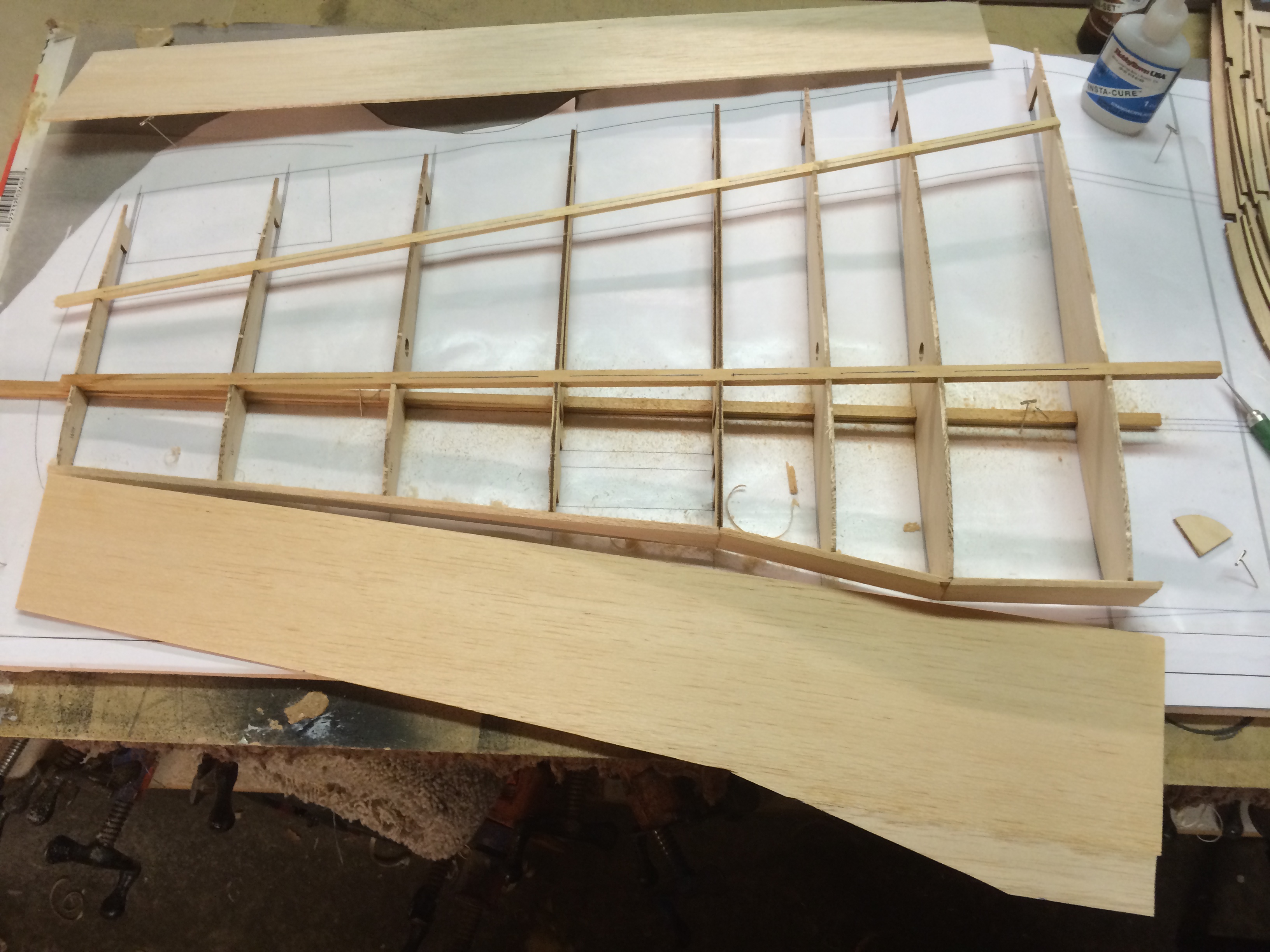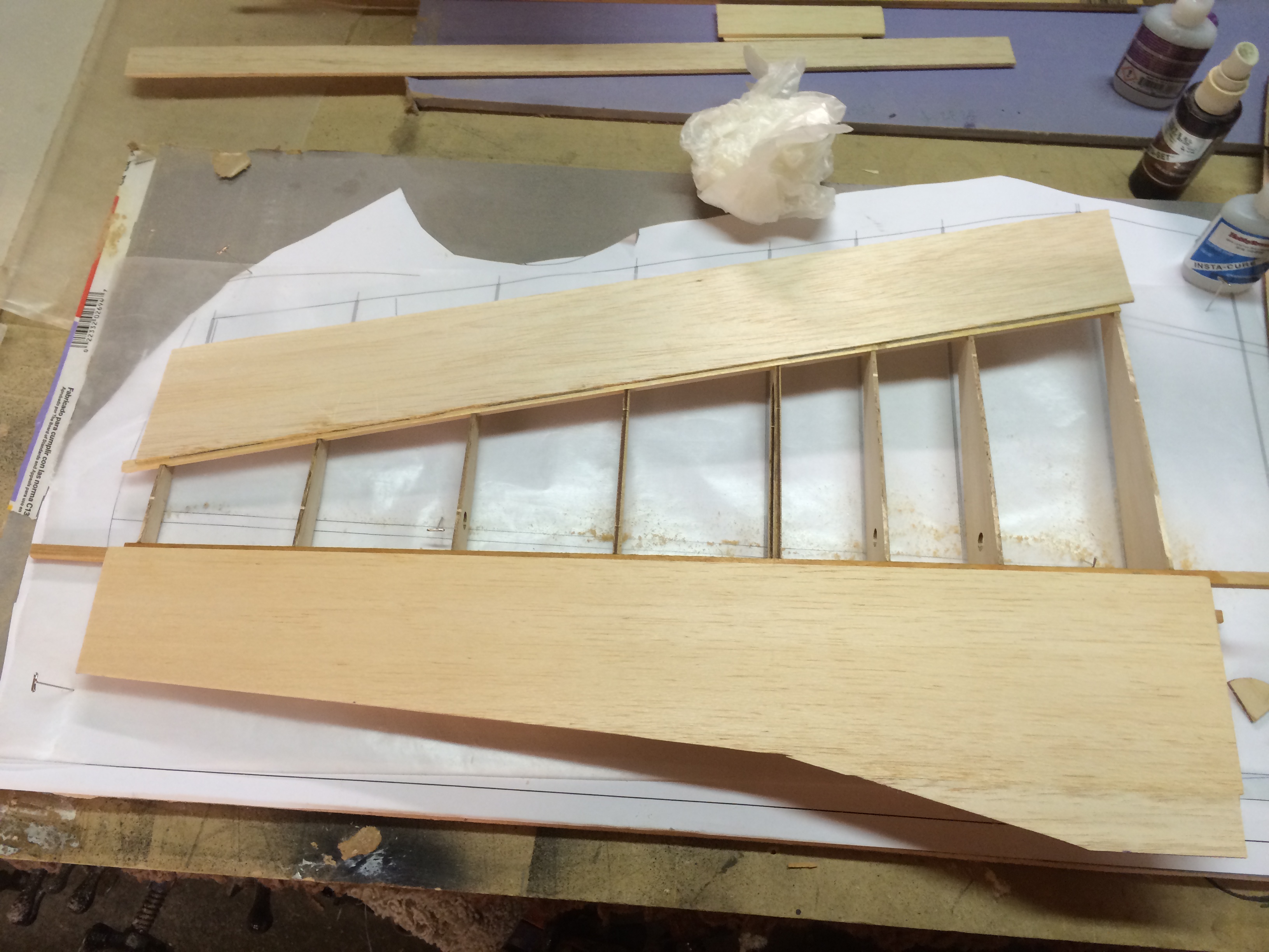 After getting all the spars in place I glued the wing skins that were prepared ahead of time to the spars from the center out with medium Ca.