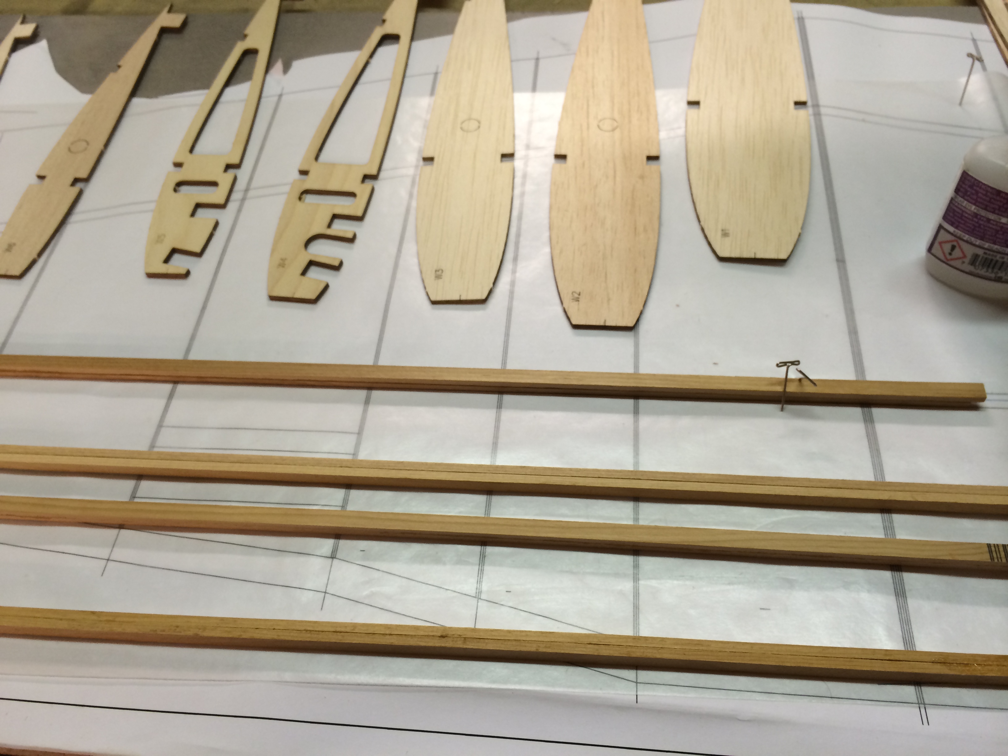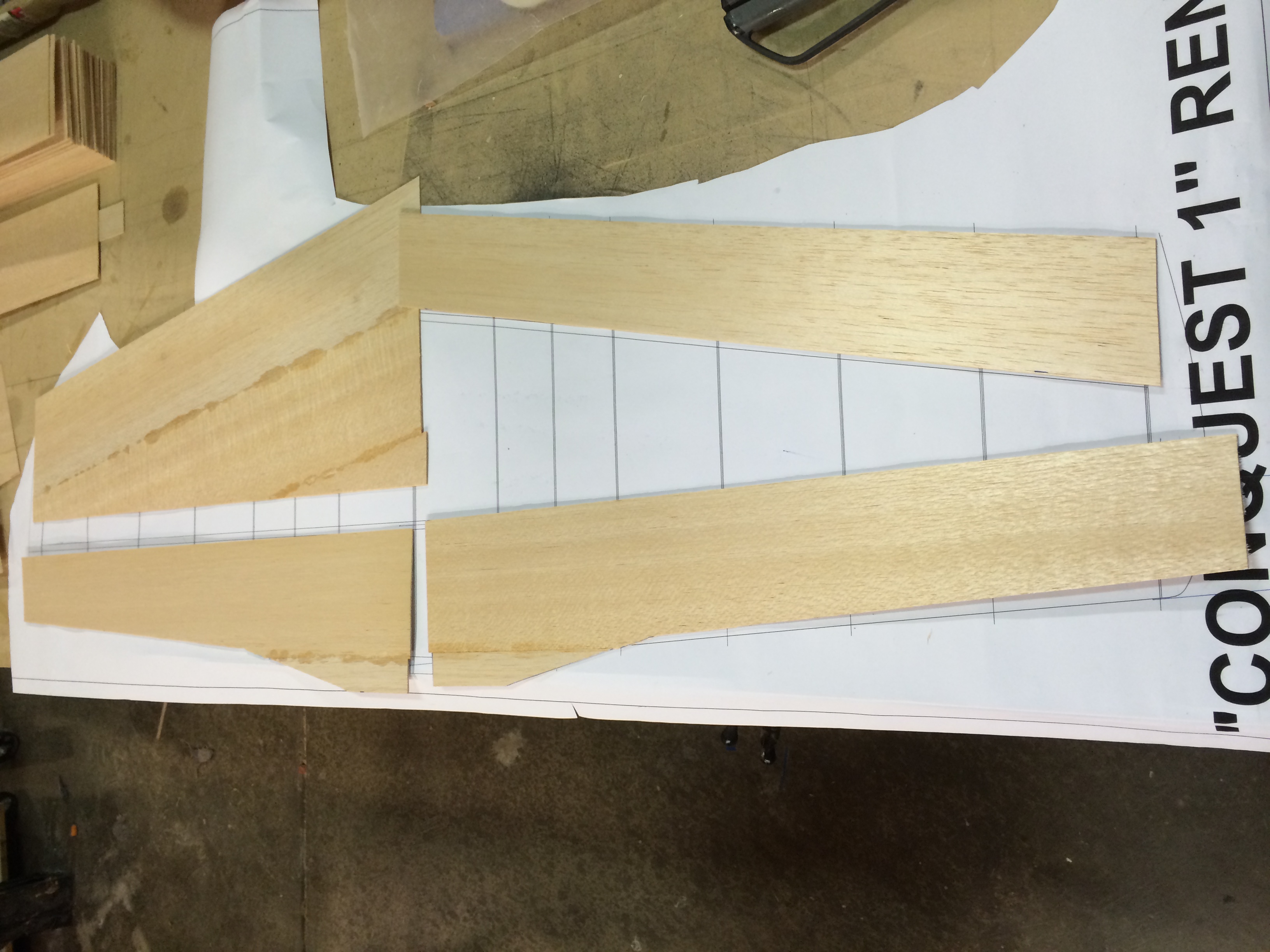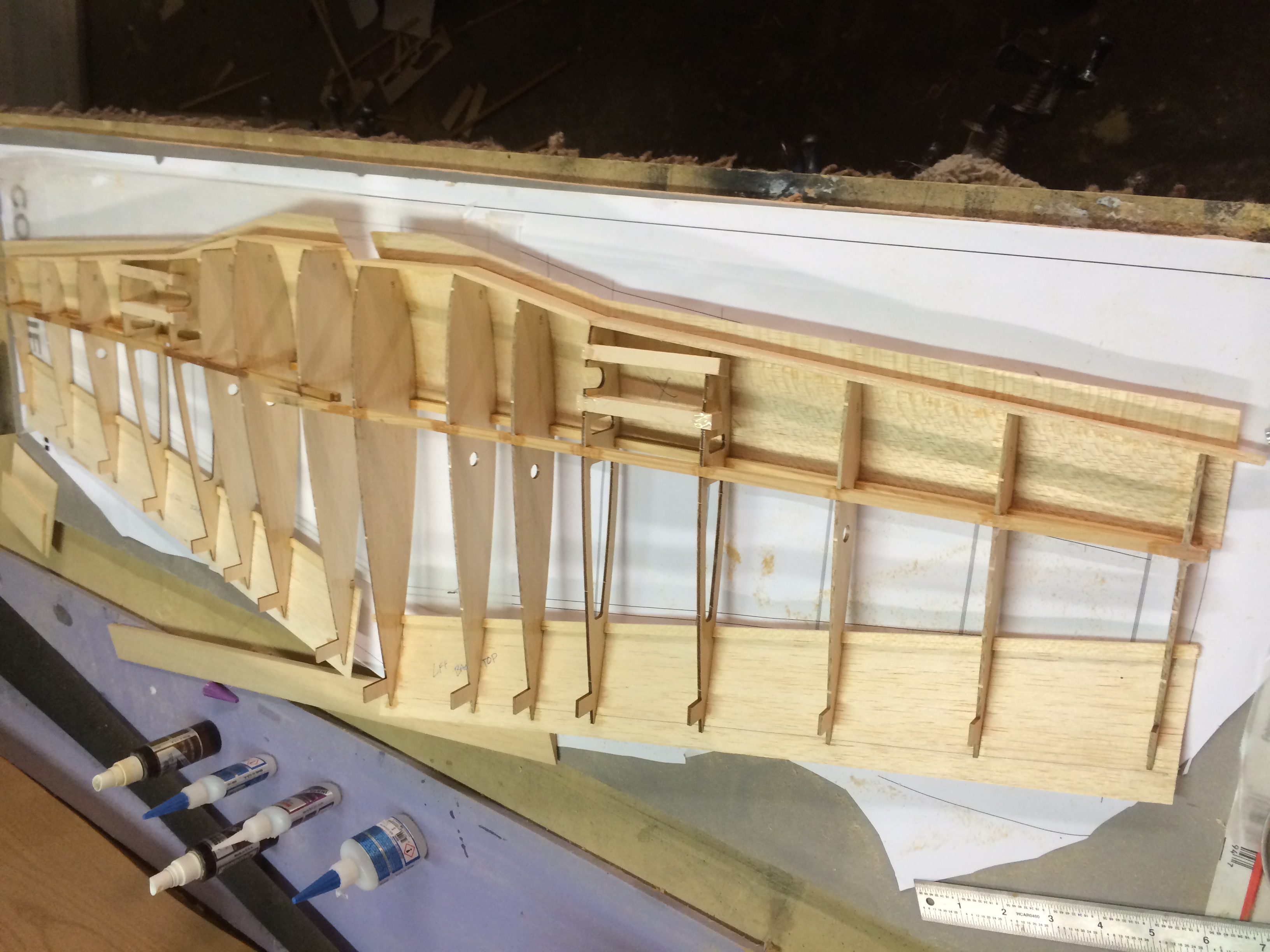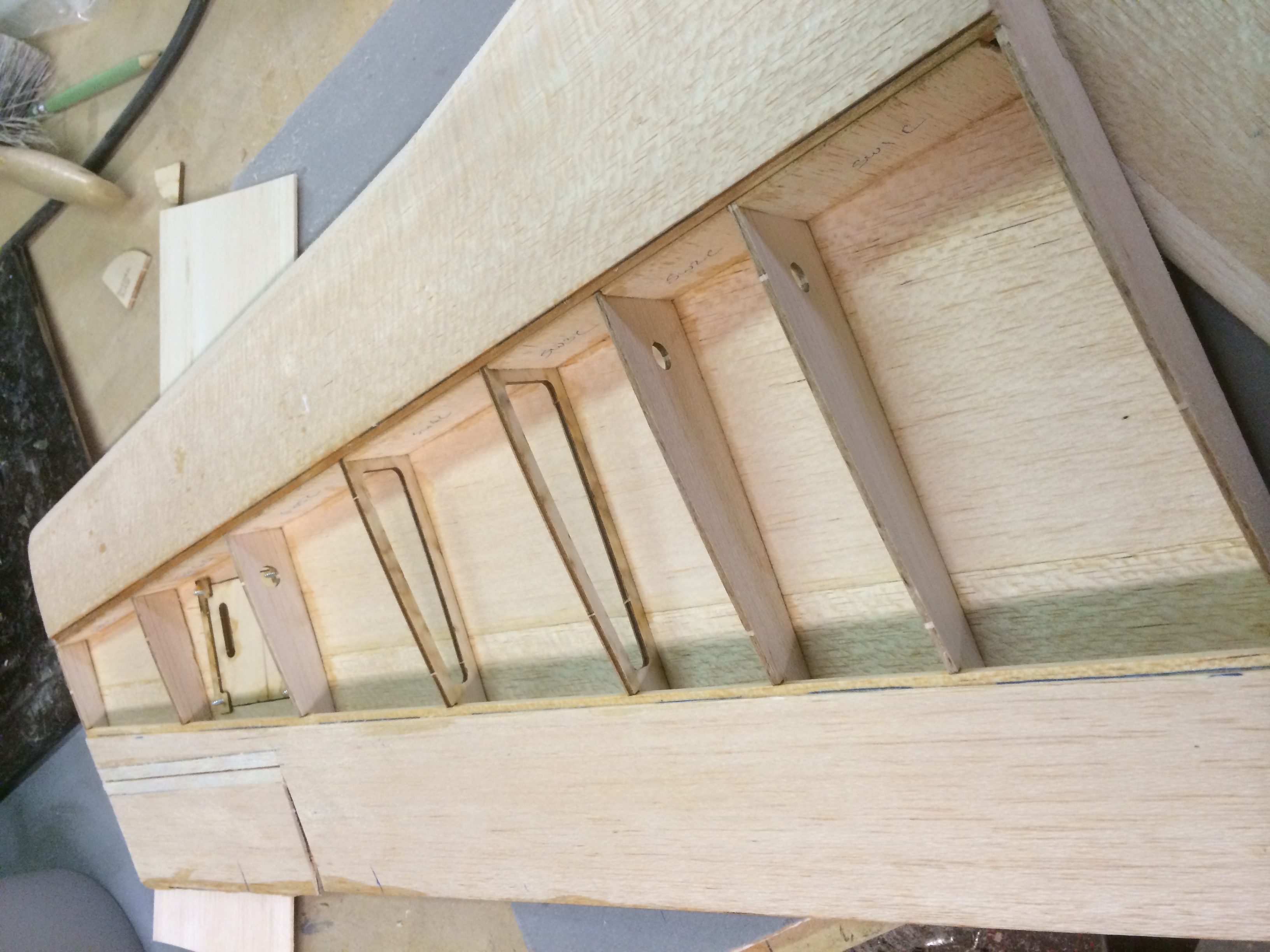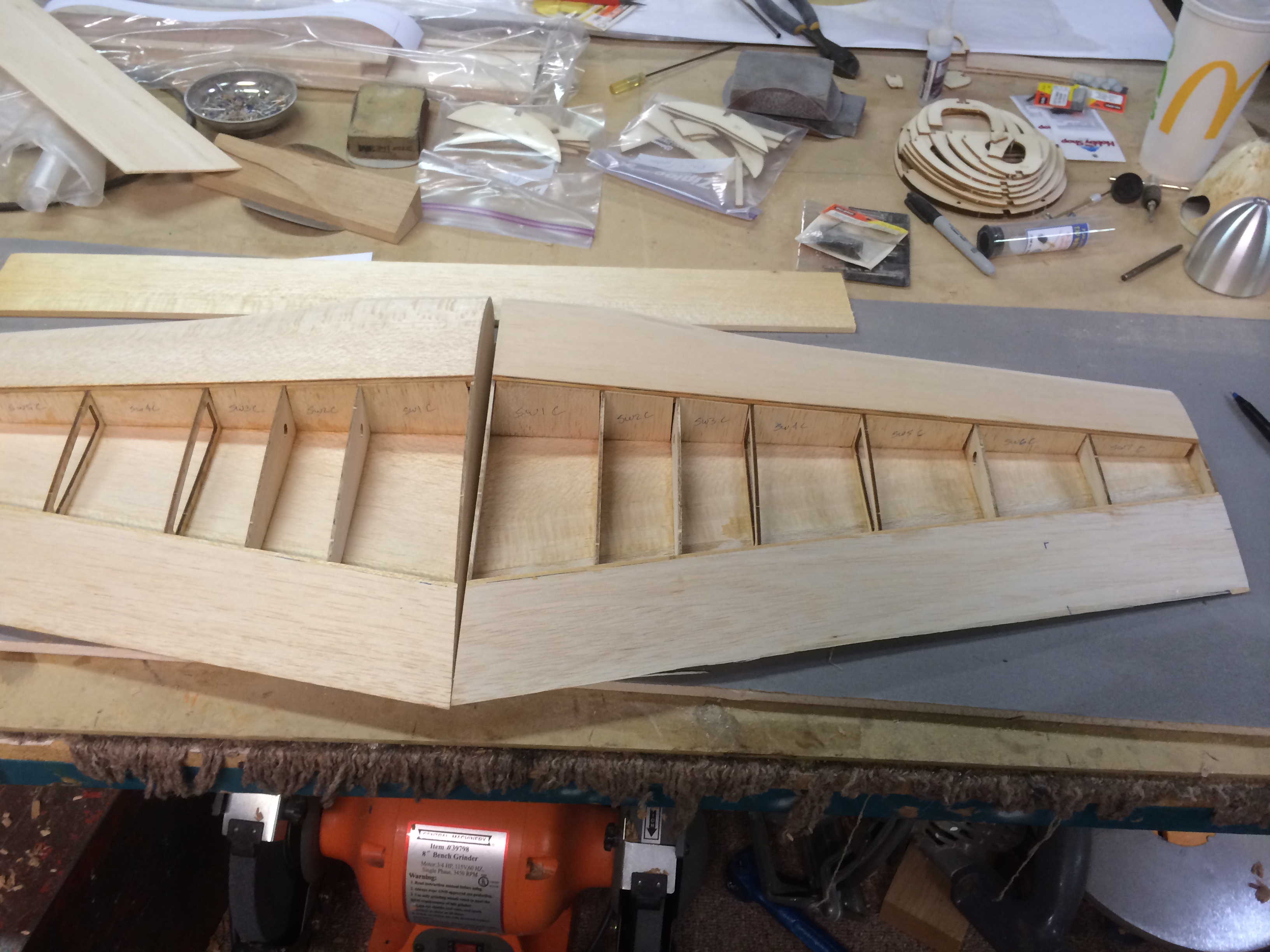 After getting all the spars in place I glued the wing skins that were prepared ahead of time to the spars from the center out with medium Ca.