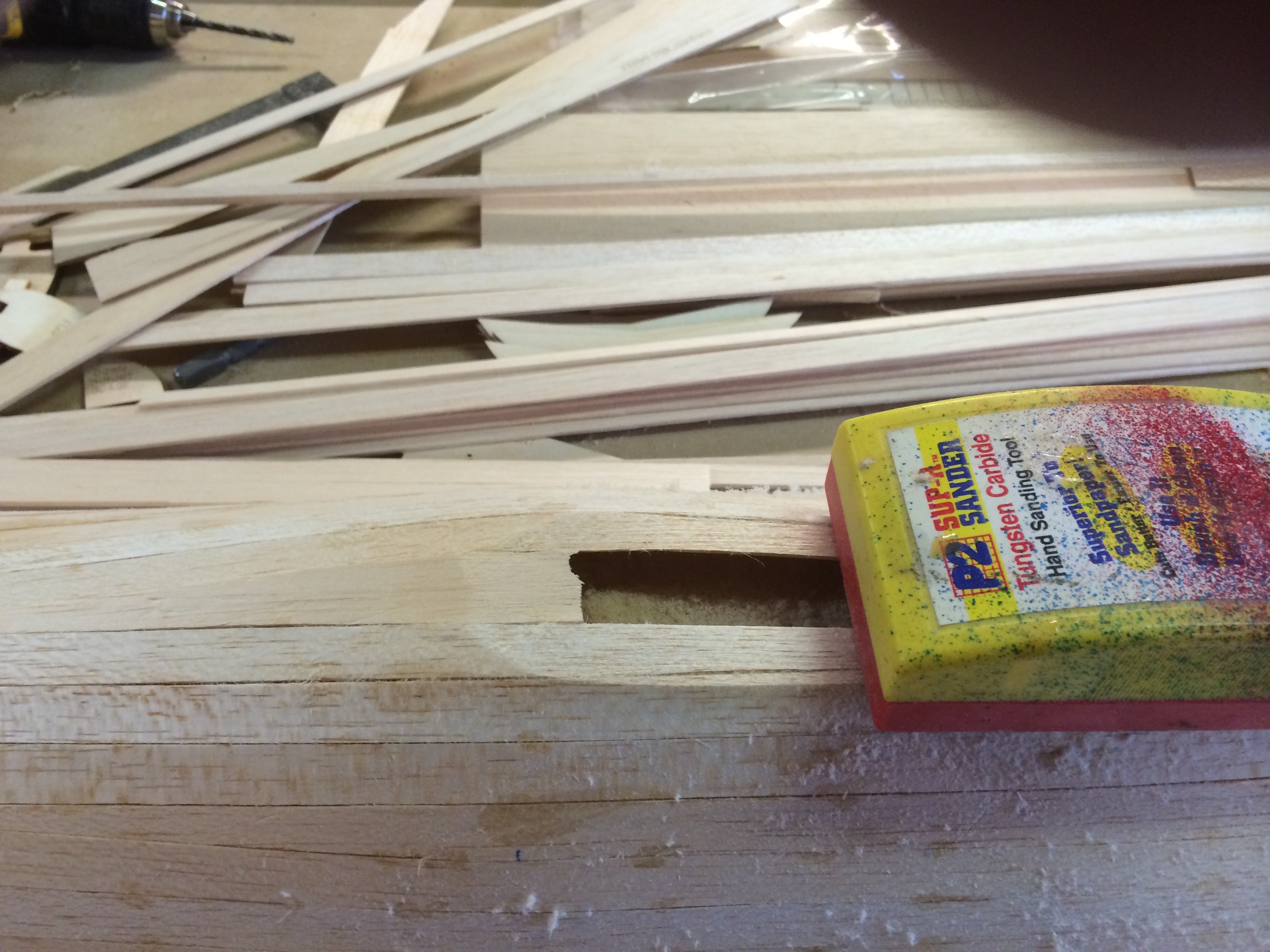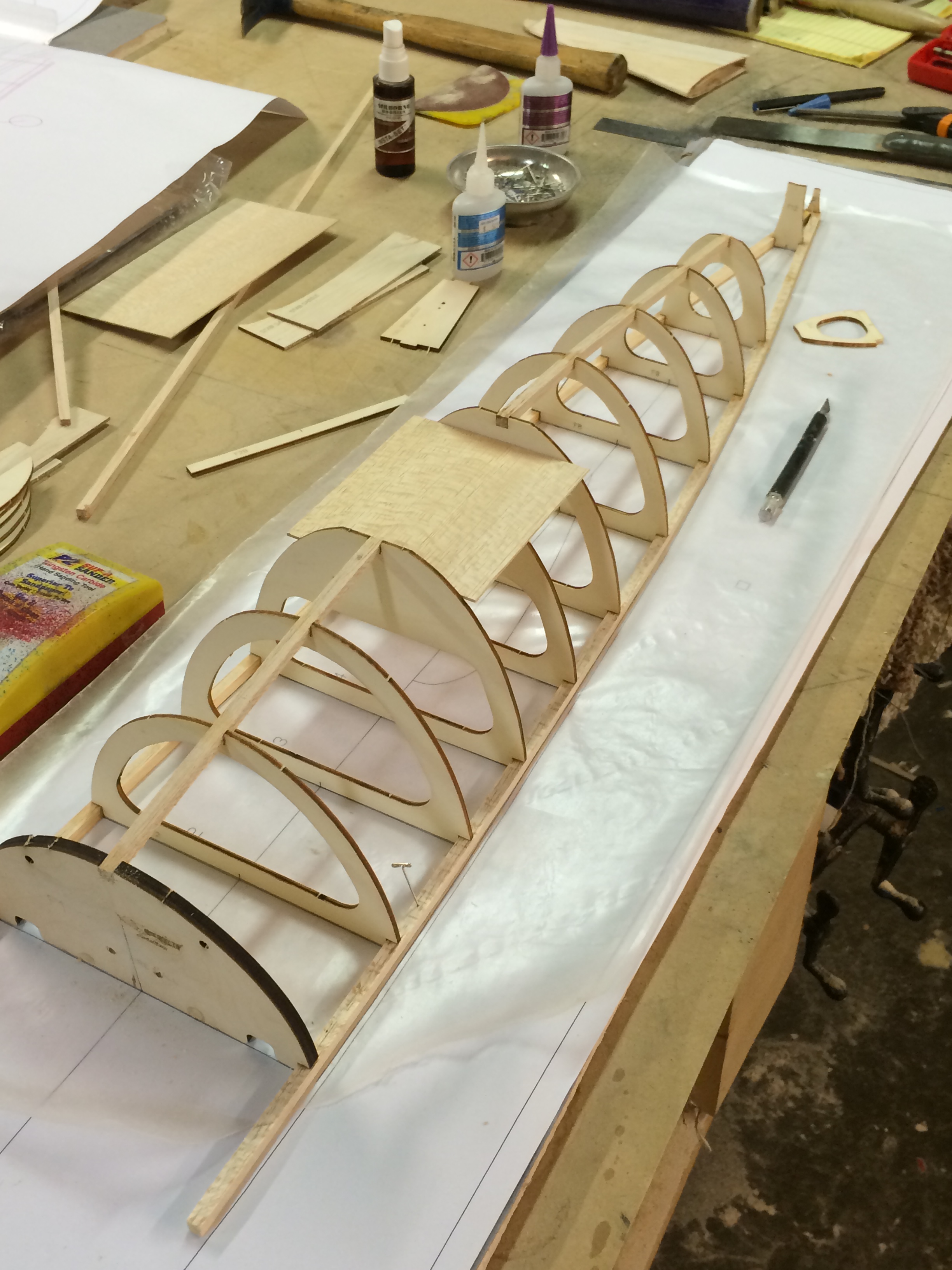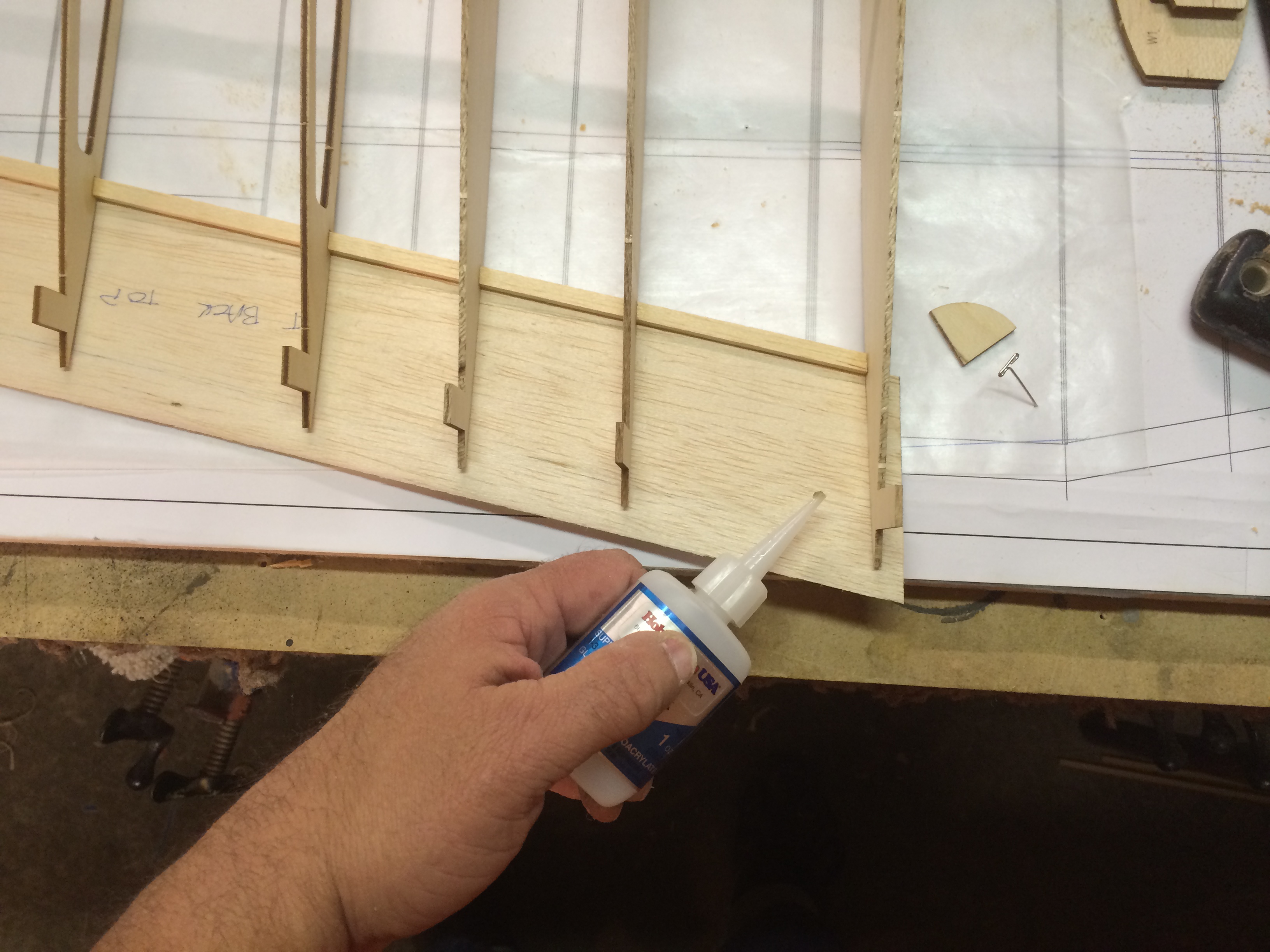 Then I turn the wing over and glue the sheeting from the inside with thin ca working my way from the center of the rib to the out side using the bench to making sure the sheeting is firmly against the ribs.