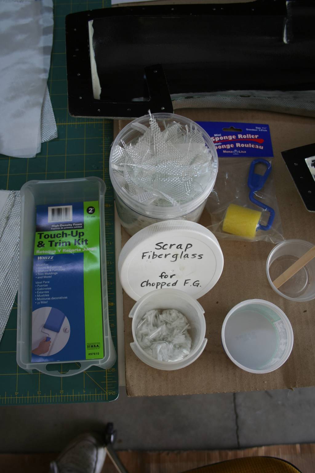 Therefore I take the really small pieces of my scrap FG cloth and put it in a small Tupperware container. I then stick the tips of sharp scissors inside the container and cut repeatedly. I want thecloth to be mainly in individualstrands, but don't overdo it or you won't havemuch strength being added(usuallyaboutthe time myhand starts getting tired, anyway). In my opinion this is a filler material that adds at least a little bit of strength, as opposed to microballoons, and also helps to hide the weave ofthe cloth being applied. Andby using the scrap, it is essentially free (I was going to throw it away, anyway), while working better for my needs than the commercially available option.